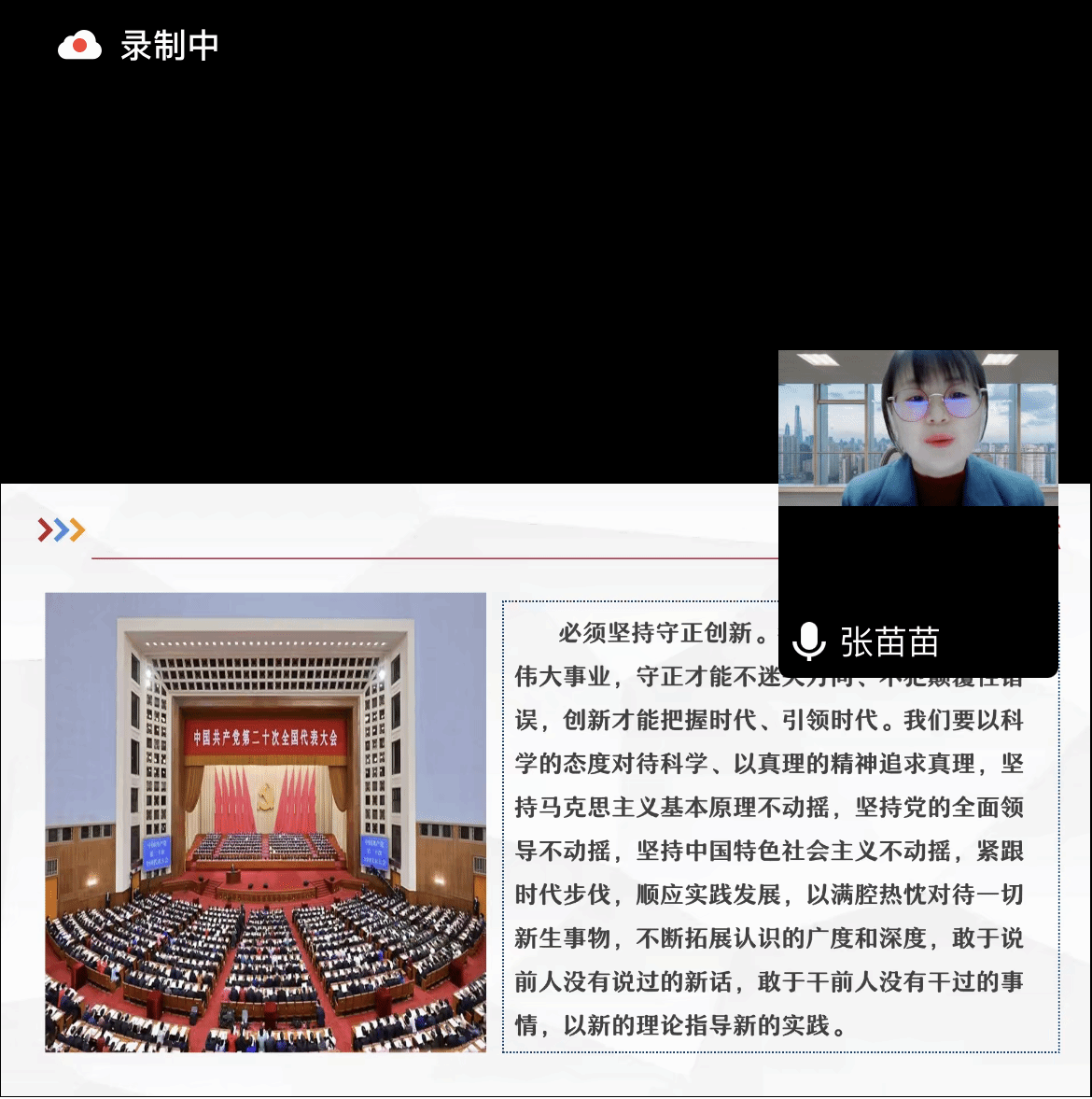 首先发言的张苗苗副教授,以“‘守正’——新时代思想政治教育创新发展的前提”为题,从学科、教师以及教学三个层面谈了如何守好基础理论研究、立德树人以及内容讲授之正。