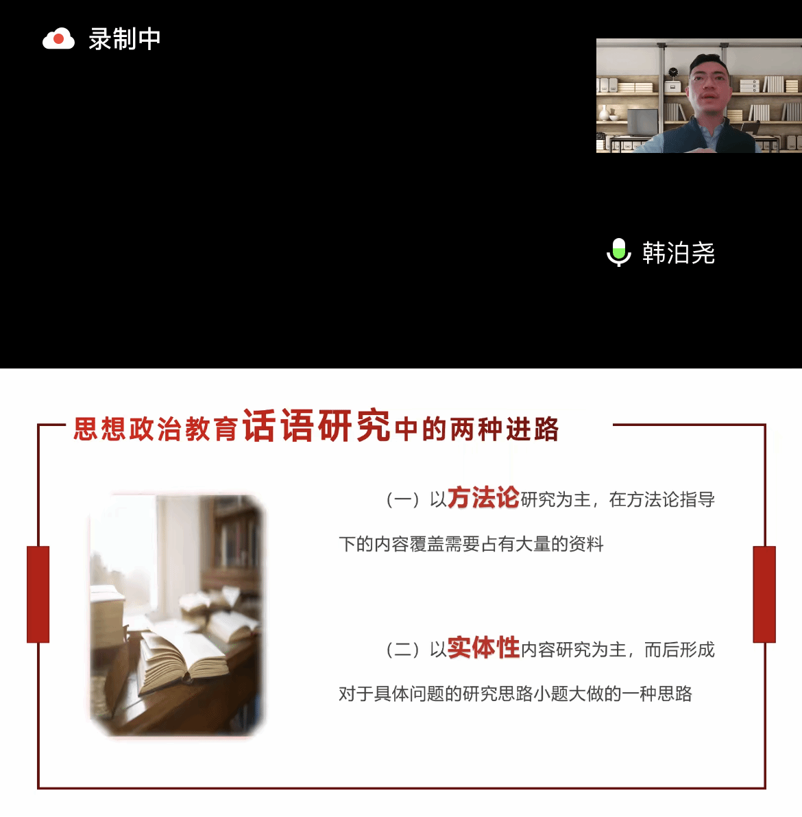 第五位发言的韩泊尧老师,主题为“新时代思想政治教育话语阐释分析”,他从分析思想政治教育话语研究中的不同进路入手,强调作为方法论的话语阐释所需的学科理解基础,以及在具体阐释过程中所需注意的概念和原则。