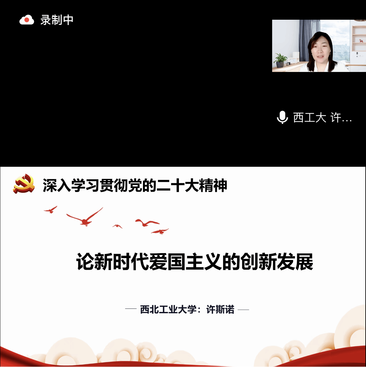 最后发言的许斯诺老师分享的主题是“论新时代爱国主义的创新发展”,她结合党的二十大报告中的爱国主义论述,剖析了爱国主义、集体主义和社会主义三者的逻辑关系,并从历史和现实两个维度,分别阐明了爱国主义传统的具体内涵,以及新时代爱国主义创新发展所面对的复杂场域。