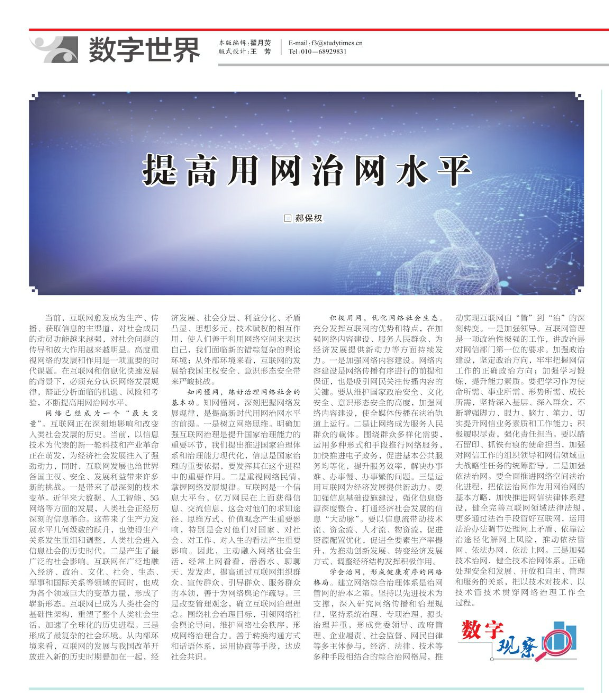 我院教授在中央内参《学习时报》发文:从四个方面提高用网治网水平。《学习时报》1999年9月创刊,中共中央党校主办,面向全国,服务全党,以各级党政干部和广大知识分子为主要对象,是国内外公开发行的全党唯一专门讲学习的报纸。