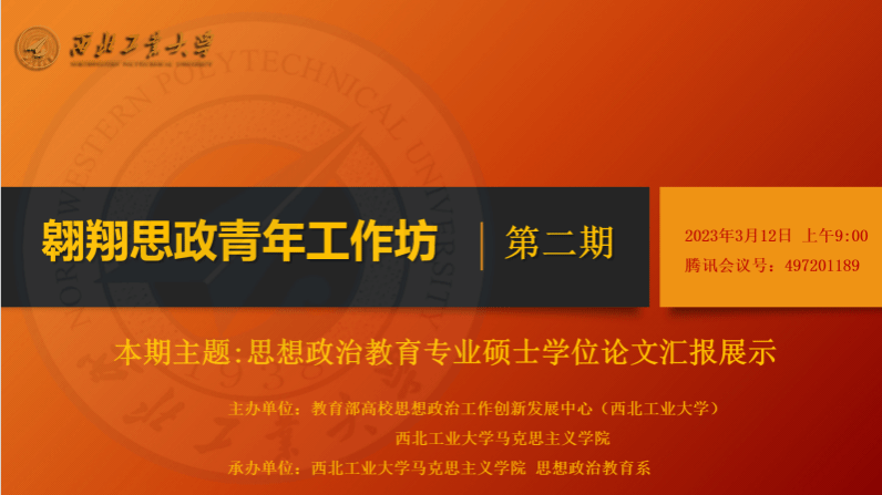 “翱翔思政青年工作坊(第二期)”以线上线下相结合的方式在学院楼208会议室成功举行。本工作坊由教育部高校思想政治工作创新发展中心(西北工业大学)、91国产