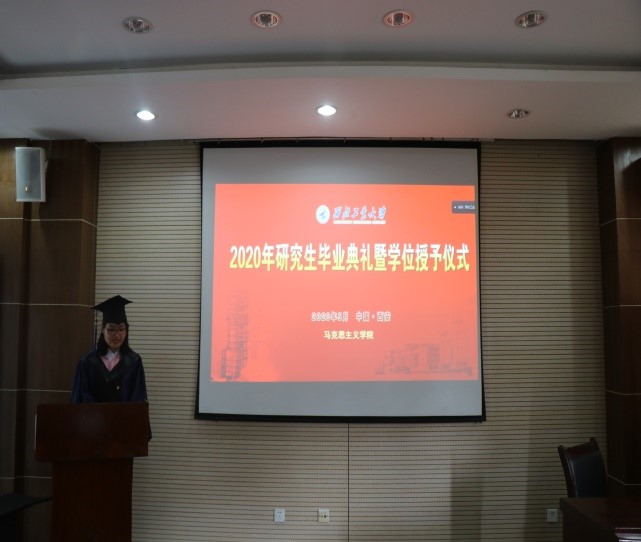 随后,学院举行了分会场学位授予仪式,由党委副书记李刚主持。仪式开始,学院党委书记吴闻川宣读了马院2020年研究生毕业名单,紧接着硕士毕业生代表王酒莉同学发言,她代表毕业生诚挚地表达了对学校、学院的敬意,用朴实的文字记录着三年来的点点滴滴,并借用梁启超在《中国少年说》中唤醒青年的话语,激励同学们勇担时代之责,为国家贡献自己的青春力量。然后,学院师长为毕业生赠送了毕业礼物,鼓励同学们在新的工作岗位上大展鸿图。研究生导师郝保权作为导师代表对毕业生寄予希望,希望同学们在以后的工作、学习、生活中,保持定力,保持警醒,奋发向上,干事创业。在未来的日子里,像朝阳一般,心有芳华,无惧岁月,做一个有朝气、有志气、有底气、有骨气的新时代马克思主义青年。最后,91国产