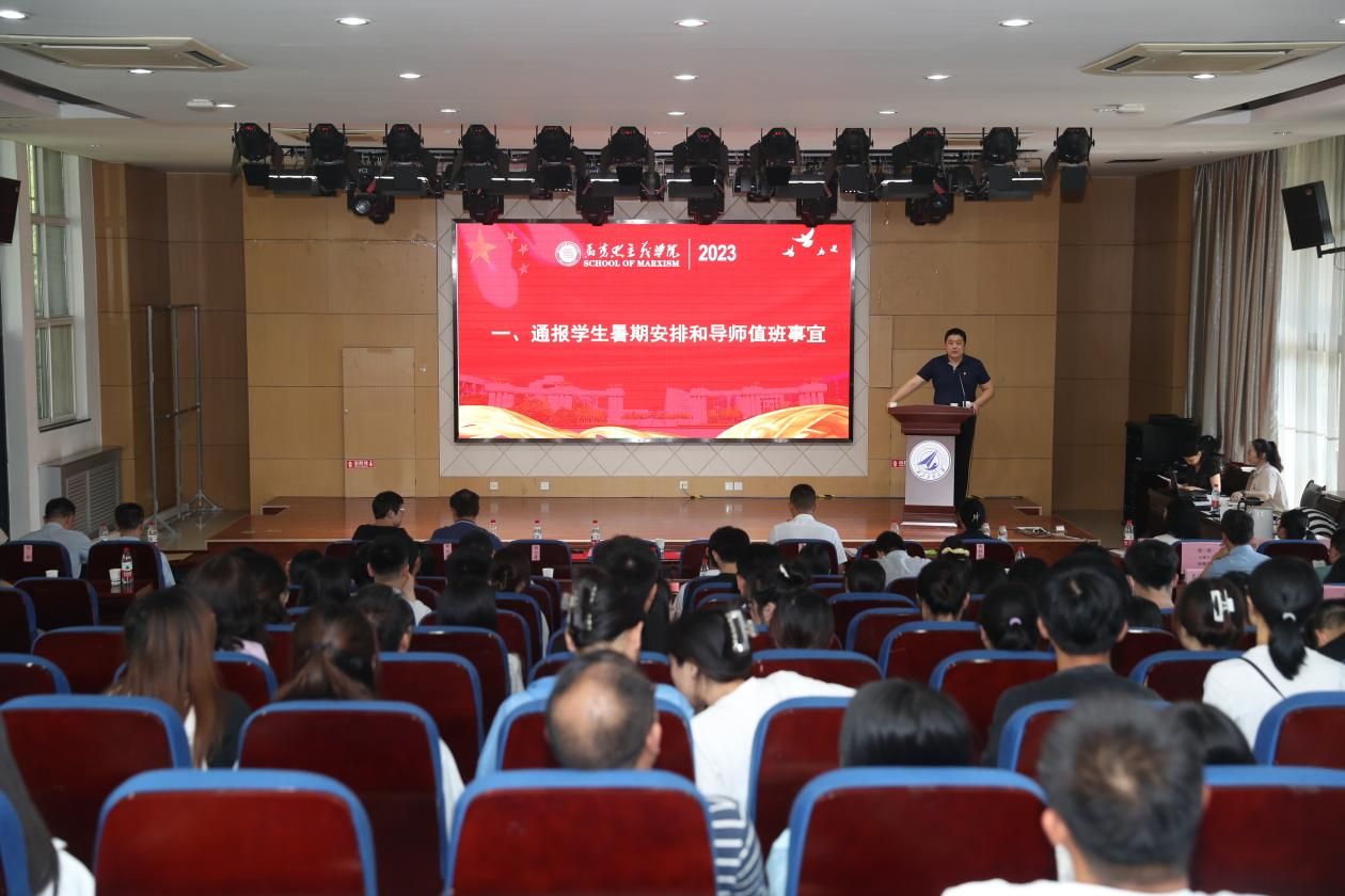 党委副书记李刚通报了学生暑期安排和导师值班事宜。学生放假时间为6月26日至9月3日,新生报到时间为8月30日,老生报到时间为9月3日。学生离开宿舍前需断掉电源和水阀,并注意交通安全。离校和返校需在学校系统中申请并经导师和辅导员审批,留校同学需按学校安排统一管理。放假期间要注意人身安全、财产安全和用电安全。教师要关注学生的学业情况和心理状况,导师要督促学生利用假期进行科研、论文写作、实习和调研,并注意安全。学院师生在发布网络言论时要合法合规,共同营造风清气正的网络环境。假期导师值班安排要求教师在指定地点、时间内打卡,并进行谈心谈话和走访宿舍,做好记录。