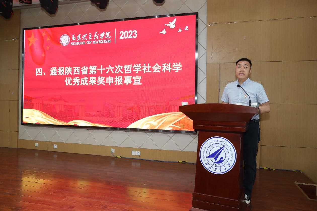 院长助理马军通报了陕西省第十六届哲学社会科学评奖的申报事宜。他介绍了申报流程和要求,并鼓励教师们积极参与评奖活动,展示自己的研究成果。