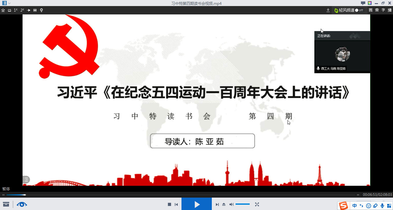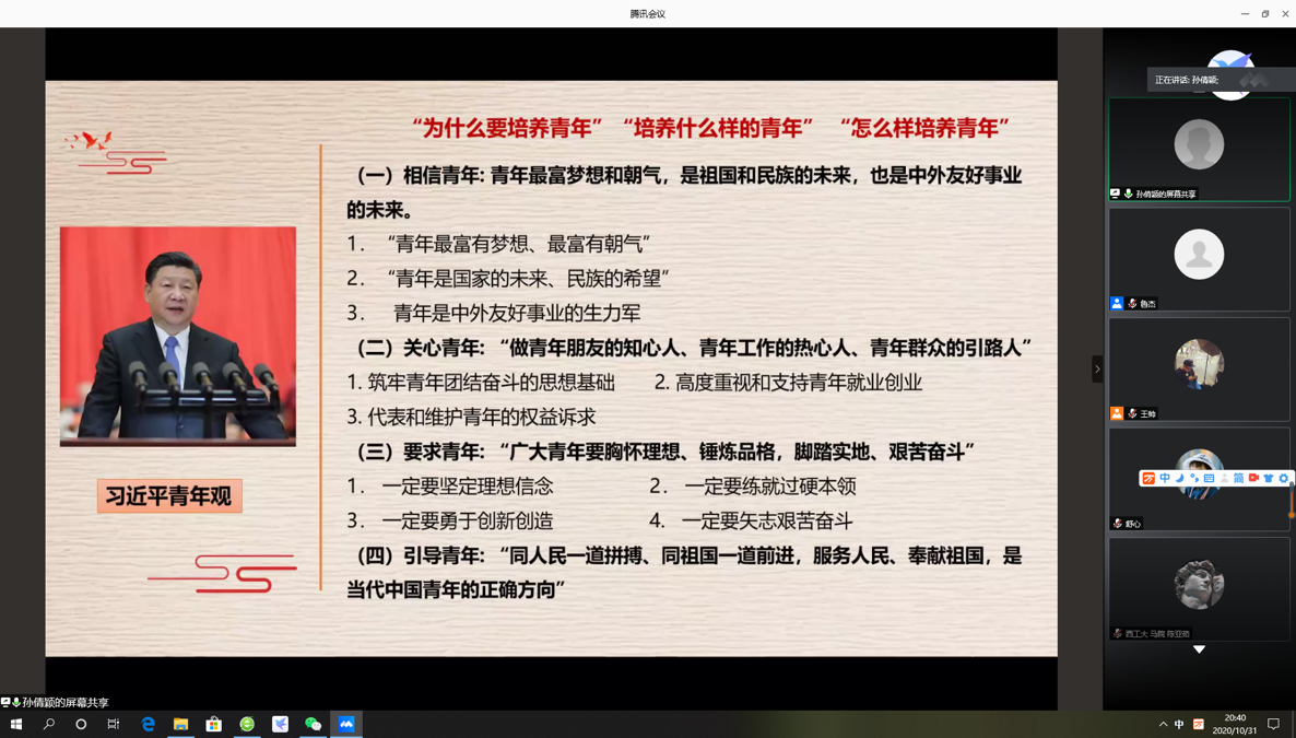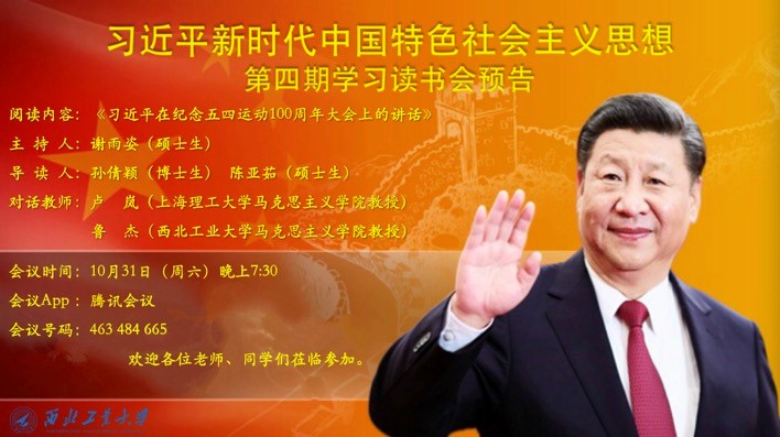 于2020年10月31日晚7:30举办了习近平新时代中国特色社会主义思想学习读书会第四期交流活动,本次读书会主题主要围绕《习近平在纪念五四运动100周年大会上的讲话》进行展开。此次活动由我院硕士生谢雨姿主持,上海理工大学91国产