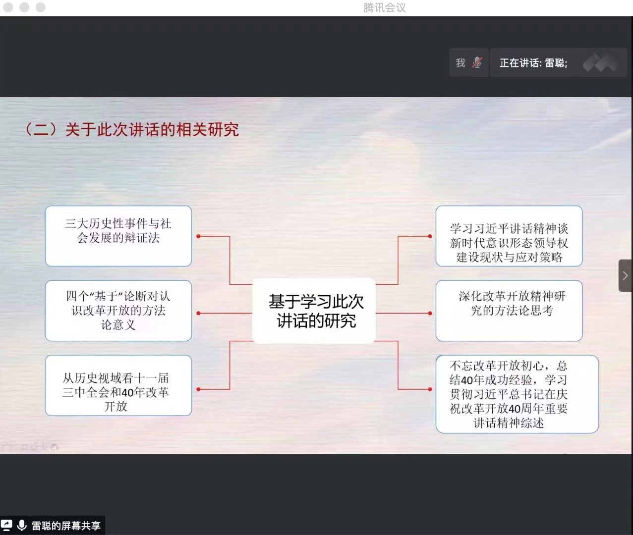 教授、博士生导师,思想政治教育学科负责人史宏波老师作为本次读书会的特邀嘉宾,我院思想政治教育系主任鲁杰老师与多位硕博生共同参加,以《习近平在庆祝改革开放40周年大会上的讲话》作为本次读书会的主要探讨内容,在本次读书会上大家展开了深入的交流与讨论。