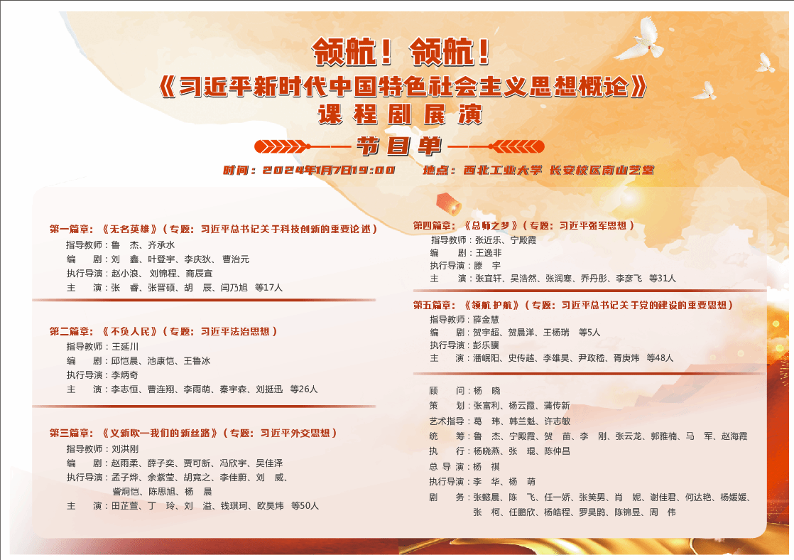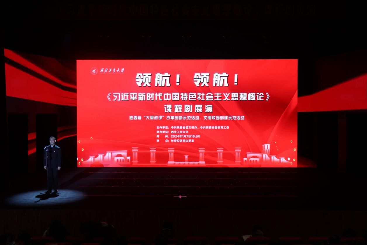 2024年1月7日晚,由中共陕西省委文明办、中共陕西省委教育工委主办,西北工业大学承办的“领航!领航!《习近平新时代中国特色社会主义思想概论》(以下简称《概论》)课程剧”在西北工业大学长安校区南山艺堂举行。