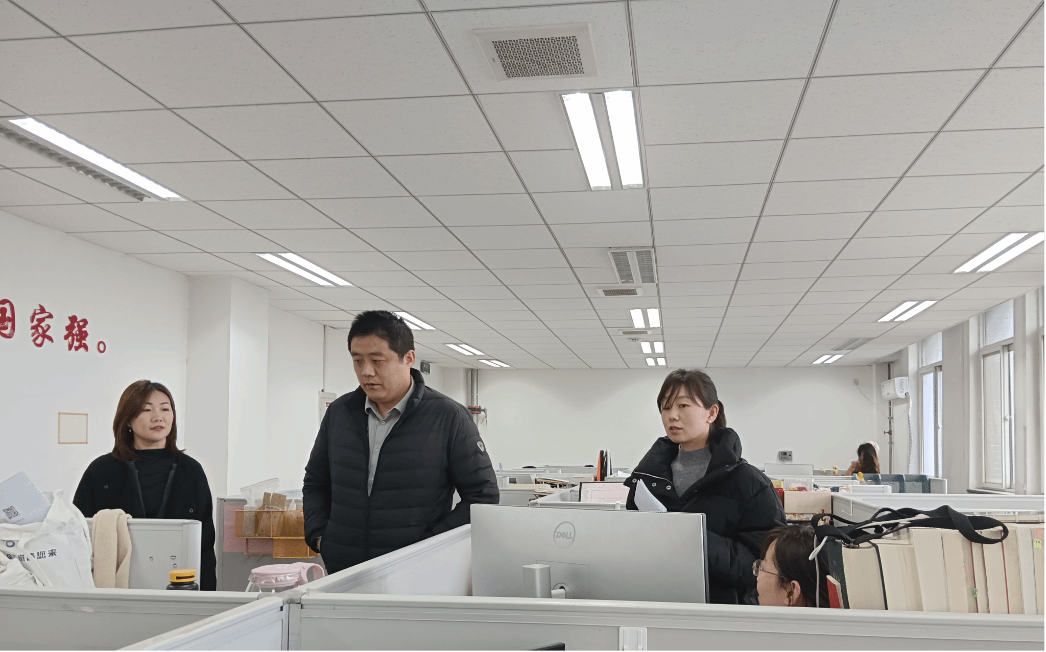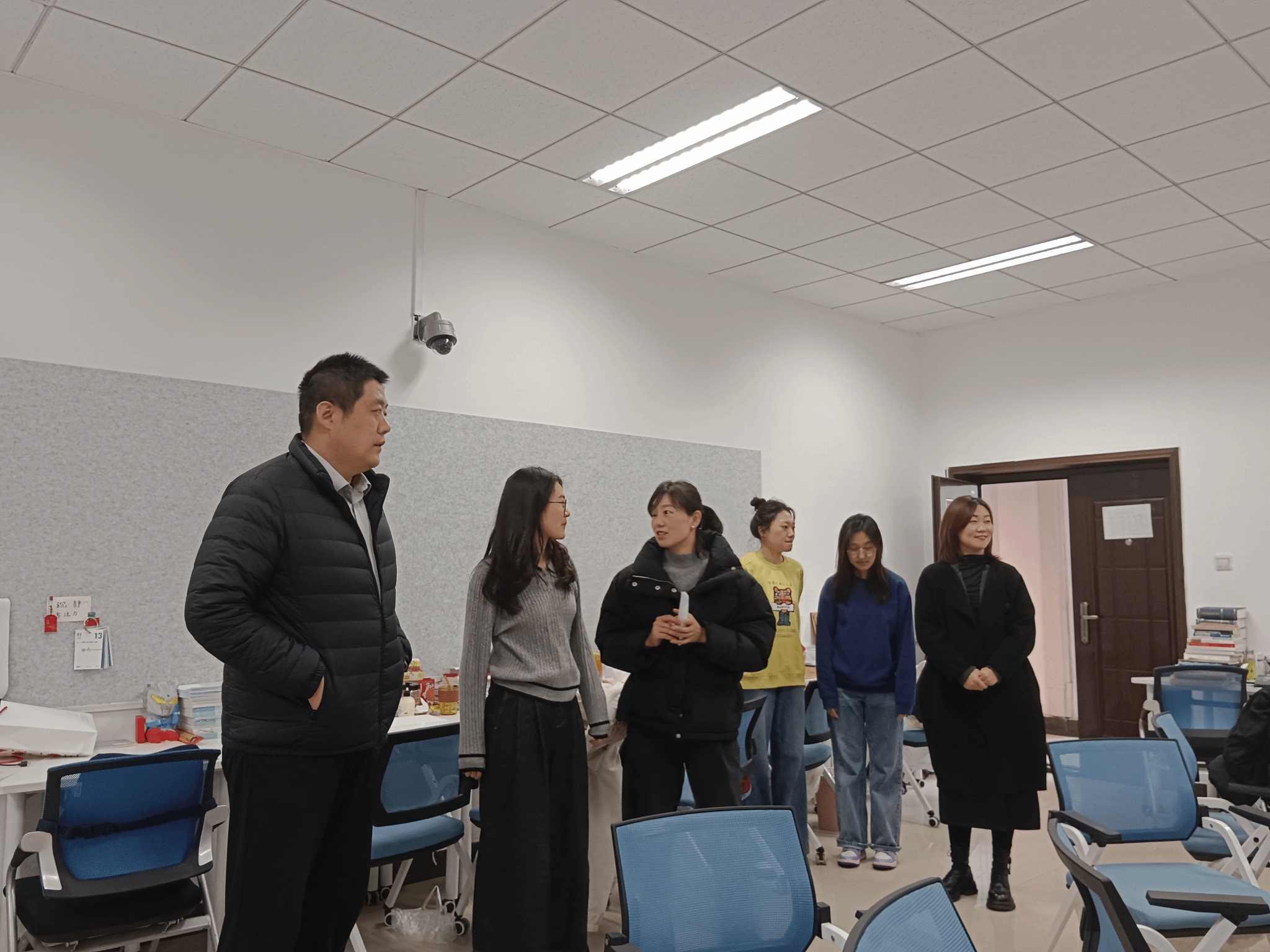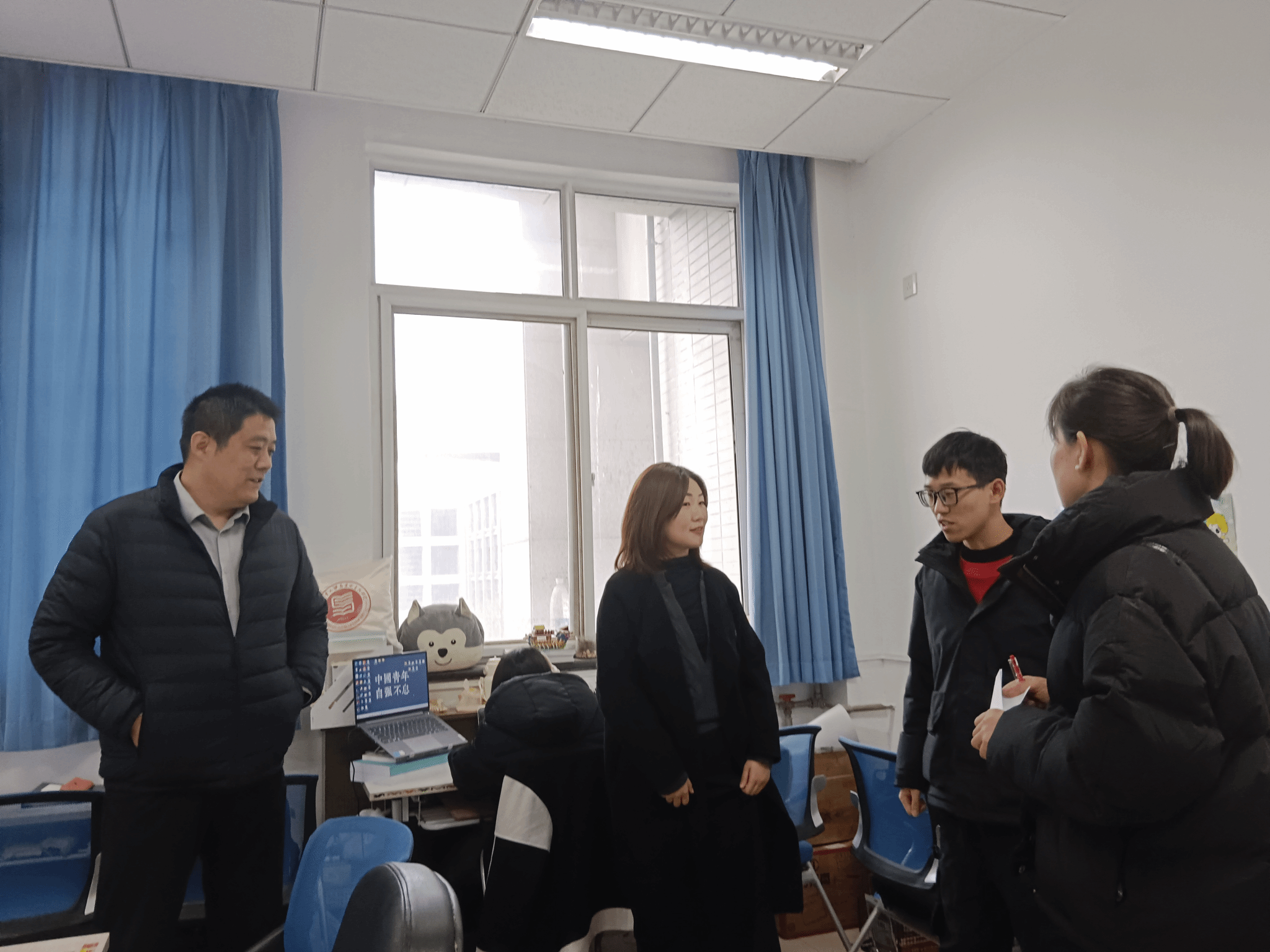 党委副书记李刚与博士生辅导员许斯诺、硕士生辅导员王换、学生兼职辅导员王夏荷一同走访学院学生自习室与各年级学生宿舍。