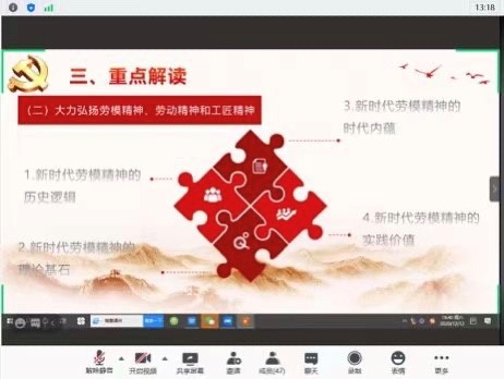 接着,活动正式进入导读环节。首先,由我院硕士生顾霜同学进行导读,她具体谈到,习近平总书记精辟概括了劳模精神、劳动精神、工匠精神的深刻内涵,指出劳模精神、劳动精神、工匠精神是鼓舞全党全国各族人民风雨无阻、勇敢前进的强大精神动力。她还重点解读了新时代劳模精神的历史意蕴、新时代劳模精神的理论基石、新时代劳模精神的时代内蕴与新时代劳模精神的实践价值等内容。我院硕士生宋金金则从背景介绍、内容概要、重点解读、问题思考这四个方面进行分析导读,谈到了习近平总书记在讲话中高度评价了工人阶级、劳动群众在中国特色社会主义事业中的重要地位和作用,并且结合了相关具体事例着重说明了新时代要大力弘扬劳模精神、劳动精神、工匠精神。并且阐述了自己的相关问题思考。