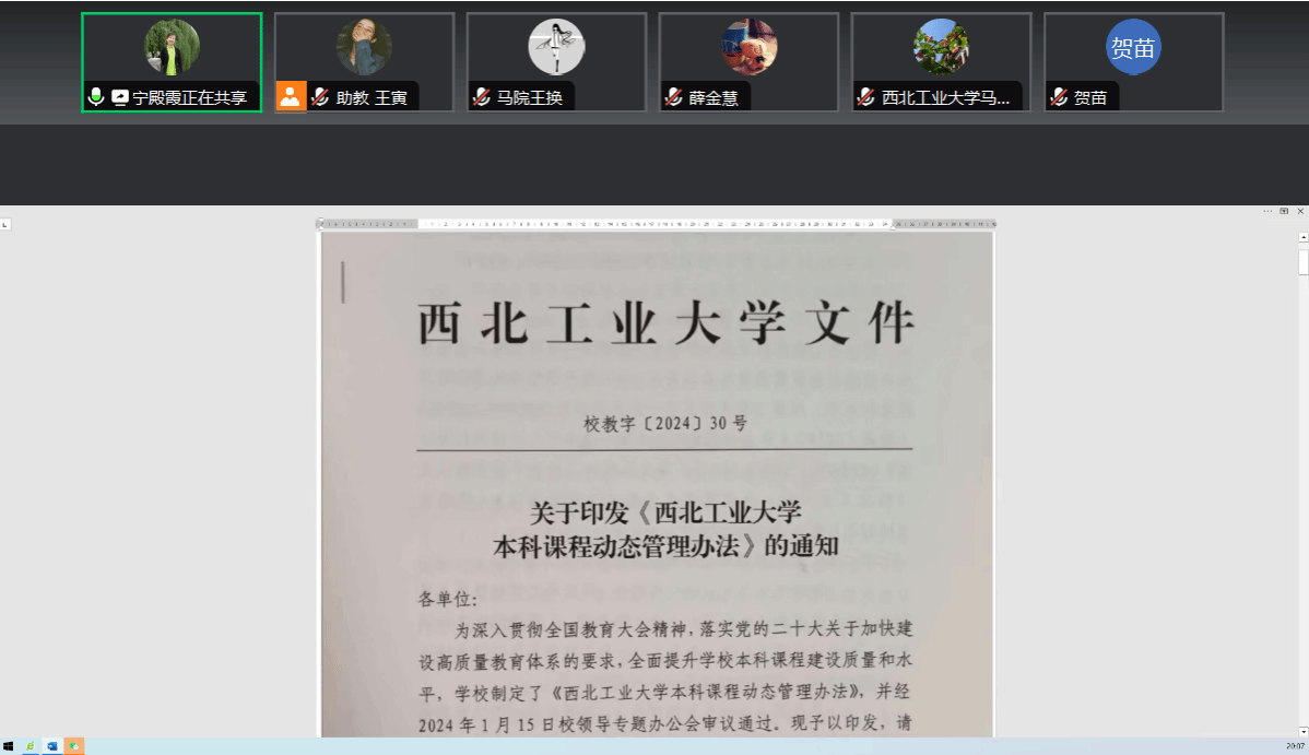 随后,《概论》课教研室主任宁殿霞副教授就关于印发《西北工业大学本科课程动态管理办法》的文件与各任课老师围绕总则、动态管理对象、课程建设与开设管理、课程过程管理、预警与退出机制等内容进行集体学习。本次学习有利于任课老师们深入贯彻全国教育大会精神,落实党的二十大报告关于加快建设高质量教育体系的要求,全面提升学校本科课程建设质量和水平。