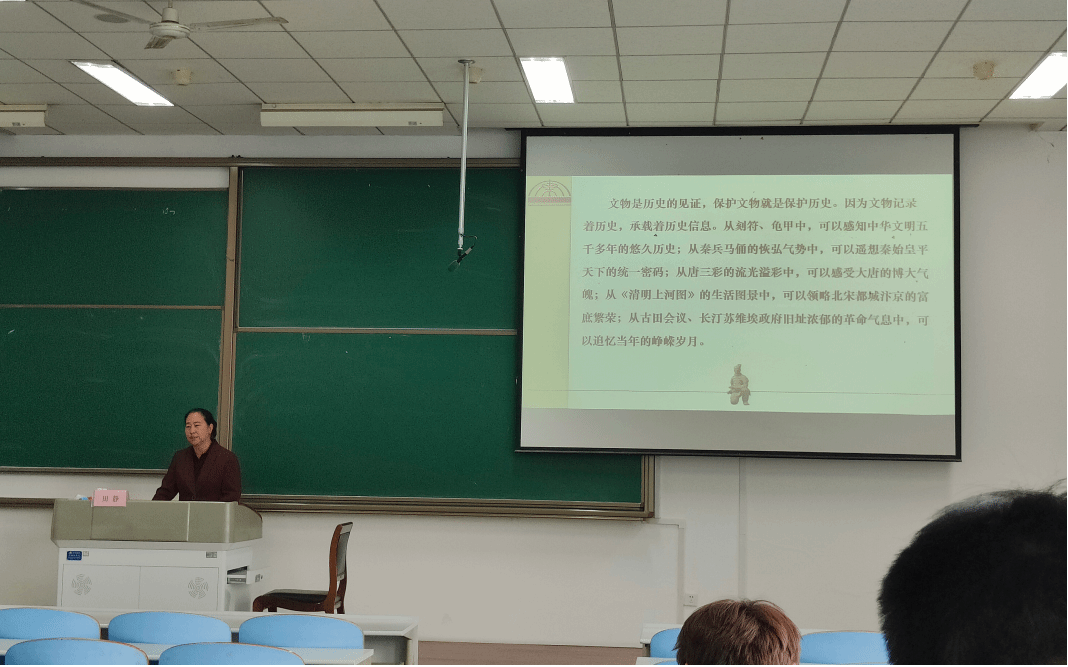 田静老师从文物是提升人民素养的资源、讲好中国故事的素材、增强文化自信的物证三个方面深入阐述了文物在传承中华文明和增强文化自信中的重要作用。首先,她分享了习近平总书记关于文物工作的重要指示精神,细致解读了如何营造传承中华文明的浓厚社会氛围,教育引导同学们不断坚定“四个自信”,不断增强做中国人的志气、骨气、底气,树立远大理想。