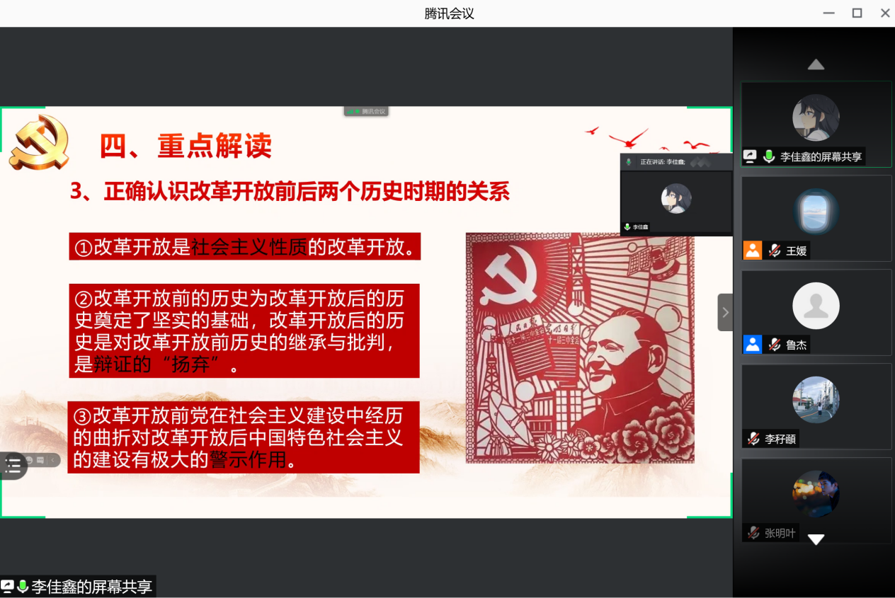 导读环节结束后,侯勇教授和鲁杰教授对两位同学进行了点评,认为两位同学对文本内容总结全面、理解准确,对文本的解读带有自己的思考,具有鲜活的特征。侯勇教授指出,本次导读的文本受到党中央的高度重视,符合当下社会发展的主题,也符合党史学习教育的主题,“只有社会主义才能救中国,只有中国特色社会主义才能发展中国”的重要论断对建设和发展中国特色社会主义具有现实的指导意义。侯勇教授建议同学们对该文本的学习应当从新中国成立70周年、建党100周年两个维度来进行分析。研究中国特色社会主义的重大意义和价值,应当回顾历史,回望来时路,从中汲取宝贵经验,坚持“两个如果没有”“两者不能割裂”“两个不能相互否定”,正确认识改革开放的历史功绩。同时,也应当眺望前行路,面向未来,将该文本作为党史学习教育的重点读物,反对历史虚无主义,为中国特色社会主义前进道路指明方向。