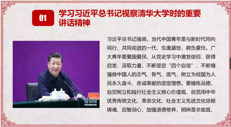 郑芳同学以“习近平总书记视察清华大学时的重要讲话”开篇,带领同学们共同学习习近平总书记的重要讲话精神,深刻体会以习近平同志为核心的党中央对青年一代的重视关怀和殷切期望。“当代中国青年是与新时代同向同行、共同前进的一代,生逢盛世,肩负重任。”作为新时代青年,我们要继续发扬五四精神,以实现中华民族伟大复兴为己任,不辜负党的期望、人民期待、民族重托,不辜负我们这个伟大时代。