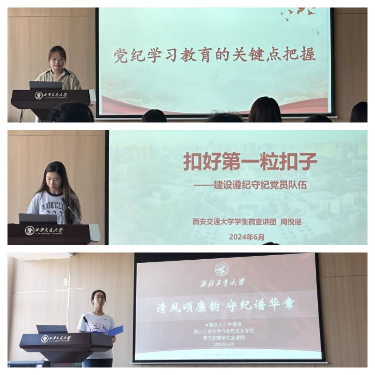 活动伊始,三校学生党员们集体联学新修订《中国共产党纪律处分条例》。西北农林科技大学人文社会发展学院郭白雪同学从关键点把握、西农建设和廉政教育的人文特色实践三个方面为大家介绍了西北农林科技大学在党纪学习教育上的具体实践;西安交通大学学生微宣讲团周悦瑶同学为大家带来了《扣好第一粒扣子——建设遵纪守纪党员队伍》的宣讲,通过多个代表性案例呈现中央八项规定精神于点滴之间激浊扬清,充分反映了全面从严治党永远在路上;91国产