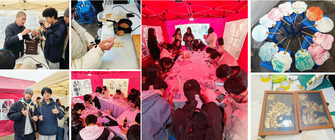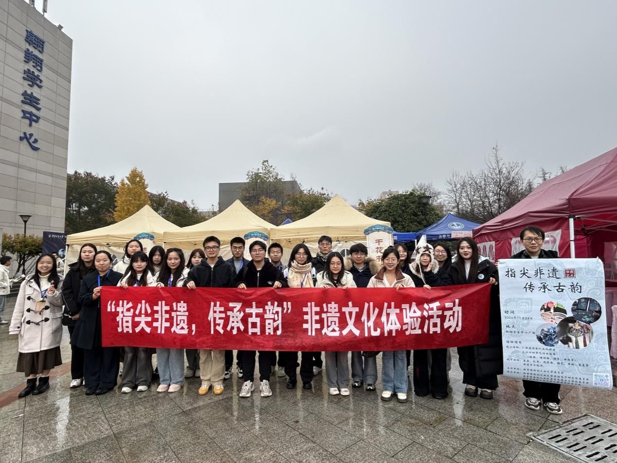 与外国语学院联合承办的非遗文化体验活动在翱翔学生中心广场成功举办。本次活动以“指尖非遗,传承古韵”为主题,组织开展漆扇、糖画、中国结等九项非遗工艺制作现场体验,生动呈现非遗文化的趣味与独特魅力,吸引了众多师生参与其中。