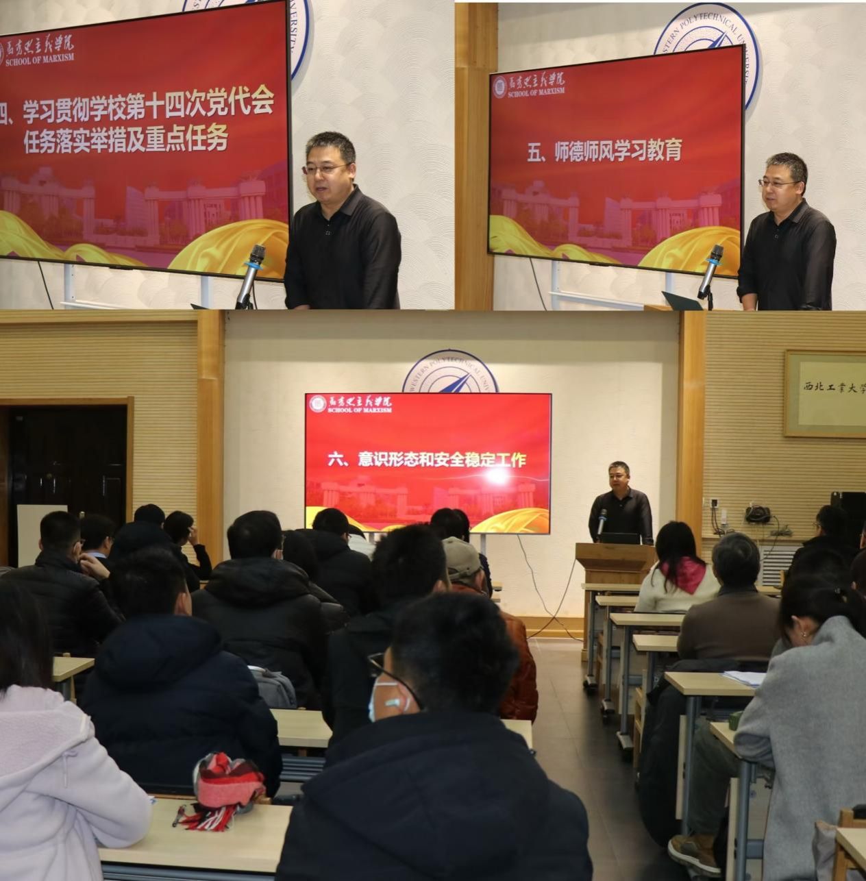 作为学习、研究和宣传马克思主义的主阵地,在这一过程中发挥着至关重要的作用,下学期,校领导将亲自参与思政课的教学和备课,进一步提升思政教育的质量和效果。同时,他带领大家重温了《新时代高校教师职业行为十项准则》,要求广大教师要遵从国家法律法规和教师职业准则要求,守牢底线,做好榜样示范。他还结合学院实际工作情况对寒假期间意识形态及安全稳定工作作了安排部署,重点抓好学生管理工作、校园安全稳定、教师言行及师德师风、阵地管理四个方面不放松。