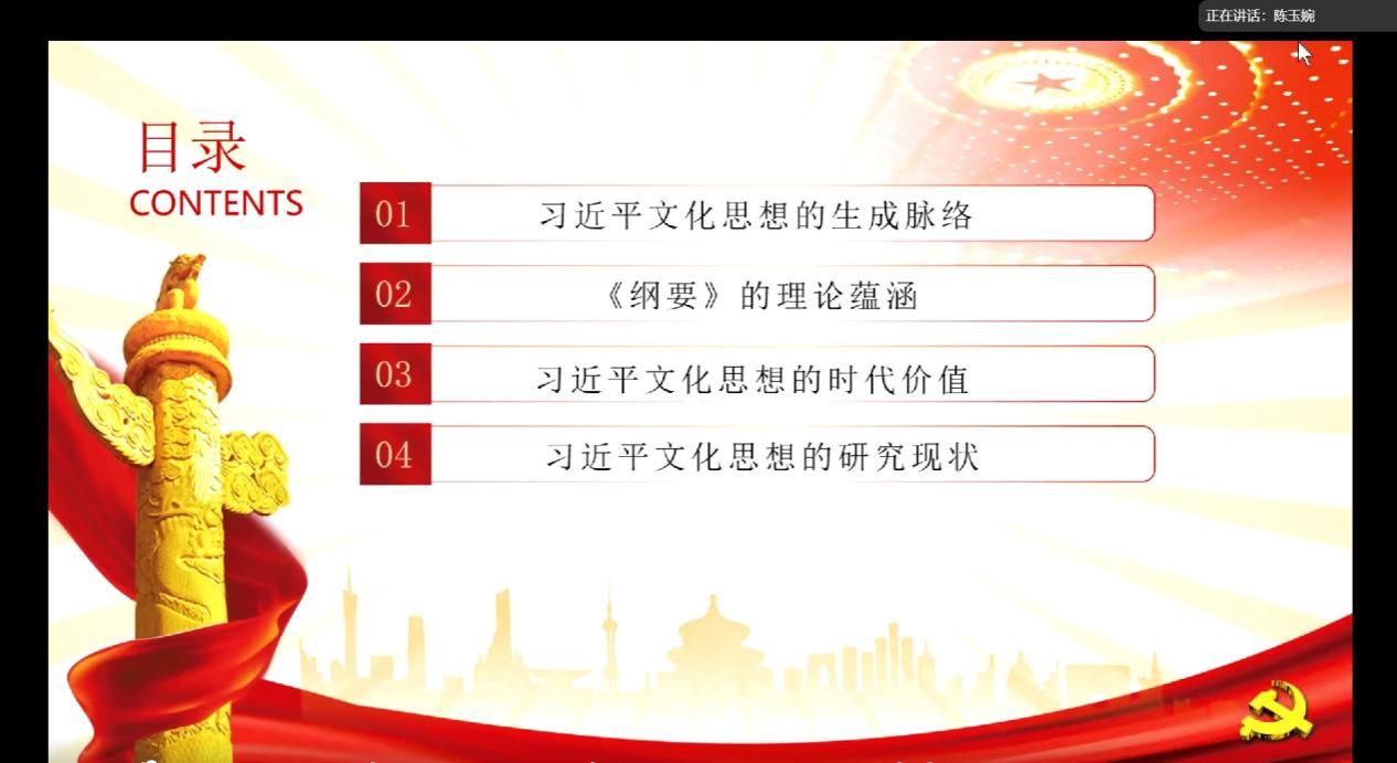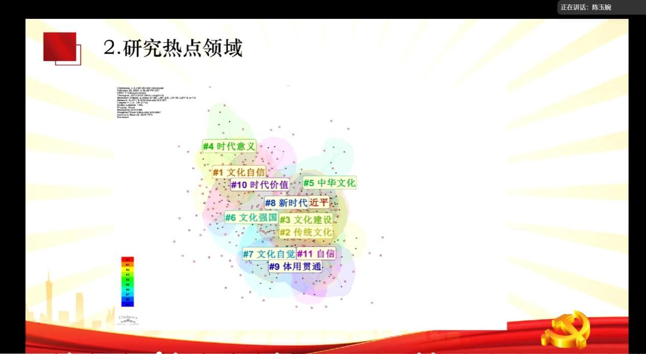 硕士生陈玉婉作为首位导读人,从生成脉络、理论蕴涵、时代价值和研究现状四个部分对《习近平文化思想学习纲要》进行了深入解读。在研究现状部分,她通过应用量化的技术方法以更加清晰、直观的方式展示了研究热点领域,使我们能够更深入地了解当前的热点方向。