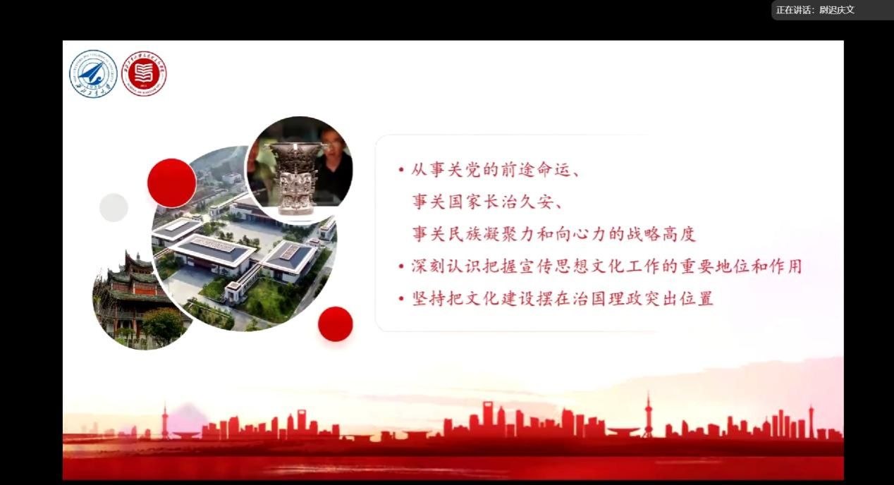 接着,硕士生尉迟庆文在认真研读《习近平文化思想学习纲要》基础上,从基本内容、发展脉络、理论渊源和实践基础、原创性贡献四个方面进行了学习分享。他提出要加强文物保护、研究与利用工作,深入挖掘和宣传文物所蕴含的深厚内涵与崇高精神。从而激发大家对中华优秀传统文化的尊崇和深厚热爱,不断增强对中华优秀传统文化的自豪感与认同感,积极弘扬和践行爱国主义精神,把中华优秀传统文化一代一代传下去。