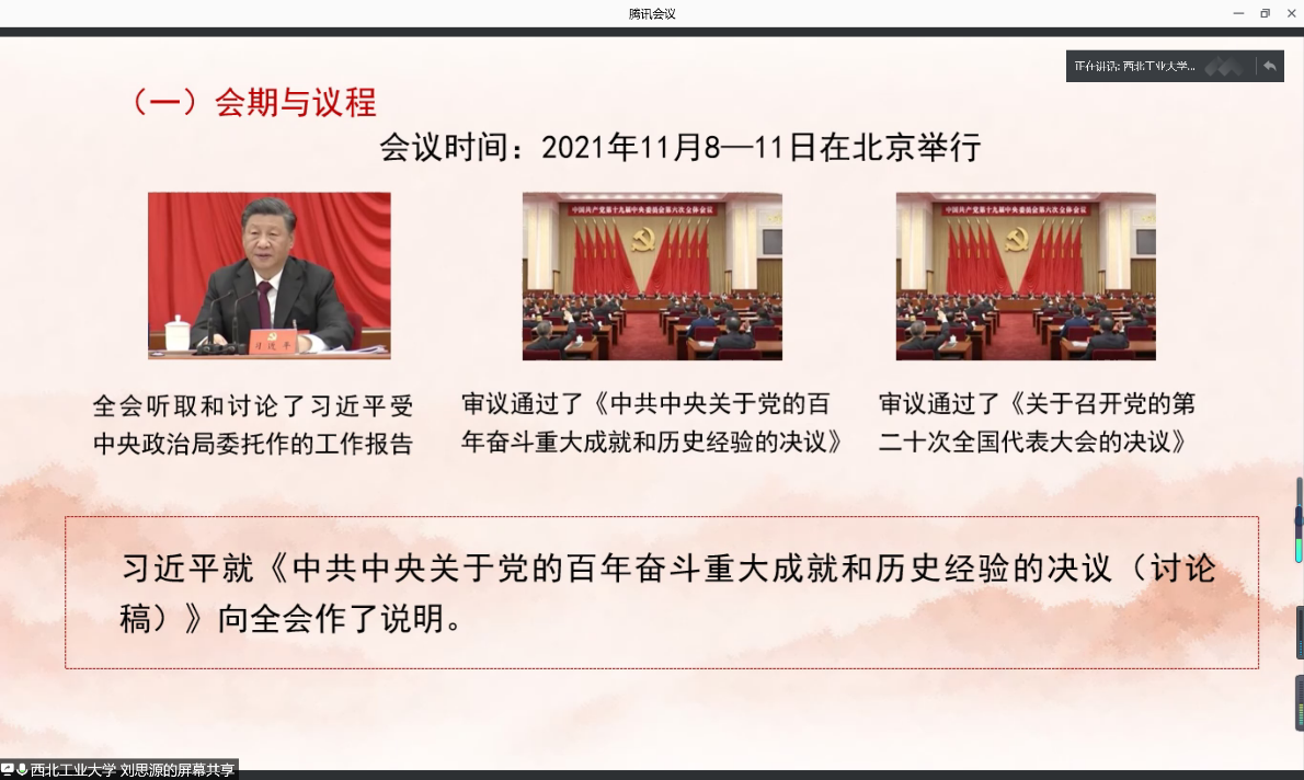 习近平新时代中国特色社会主义思想学习读书会第二十四期活动主题围绕《中共中央关于党的百年奋斗重大成就和历史经验的决议》进行学习研讨。本次读书会由我院思想政治教育系主任、博士生导师鲁杰教授发起,学院硕士生张昊主持,陕西师范大学91国产