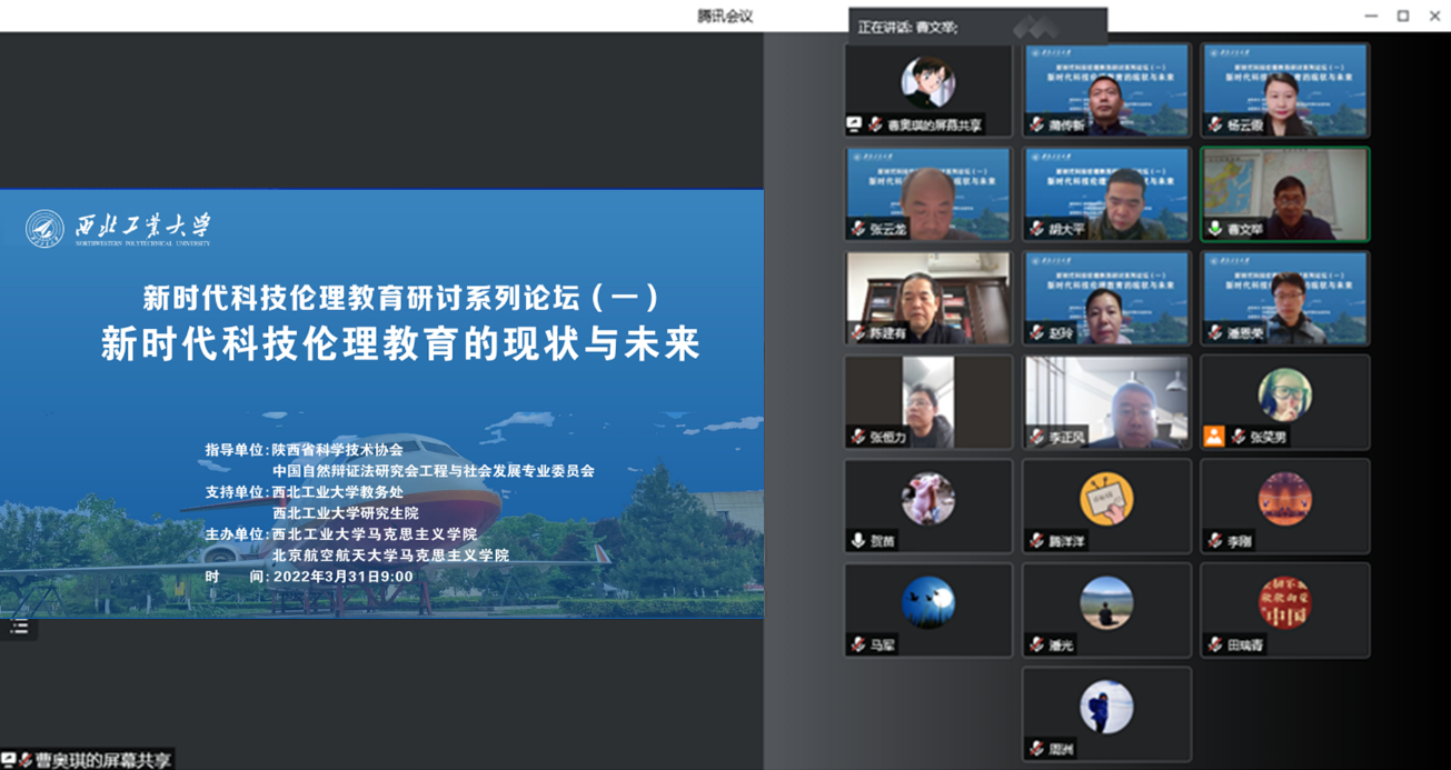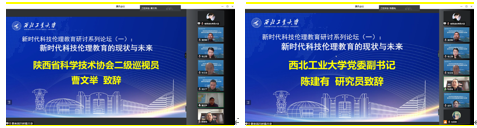 共同主办,受到了陕西省科学技术协会,中国自然辩证法研究会工程与社会发展专业委员会,西北工业大学教务处、研究生院等多方指导支持。陕西省科协二级巡视员曹文举、西北工业大学党委副书记陈建有出席论坛并致辞,与会专家学者围绕“新时代科技伦理教育的现状与未来”这一研讨主题进行相关主题报告,来自各高校、科研院所与师生300余人参加此次线上会议。本次会议由西北工业大学马院院长杨云霞教授主持。