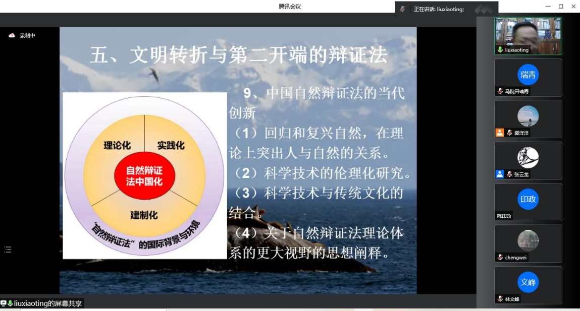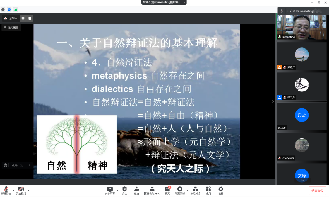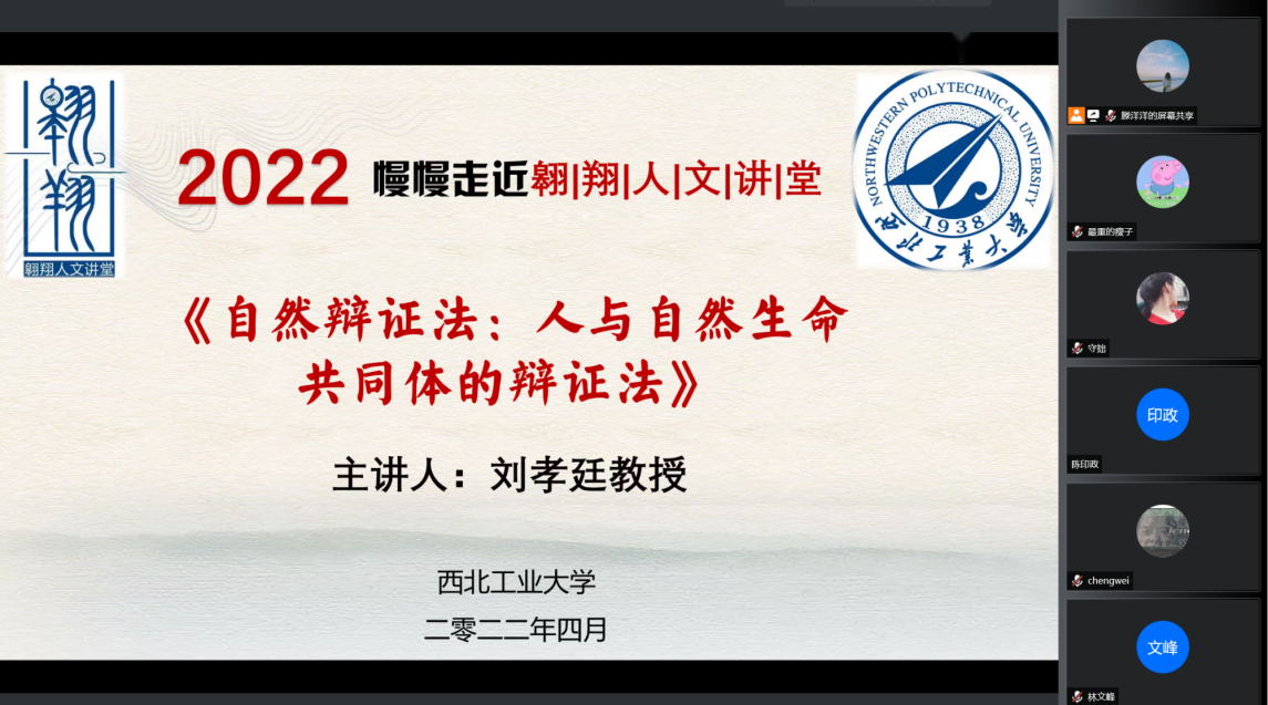 “翱翔人文讲堂”,通过腾讯会议平台直播的形式为我们带来了一场主题为《自然辩证法:人与自然生命共同体的辩证法》的精彩讲座。中国自然辩证法研究会理事长何鸣鸿、清华大学刘立教授、工程与社会发展专业委员会副主任、安徽大学王金柱教授、西北工业大学师生以及来自全国高校的二百余名同学共同参与了此次报告会。本次翱翔人文讲堂由西北工业大学党委学生工作部主办,91国产
