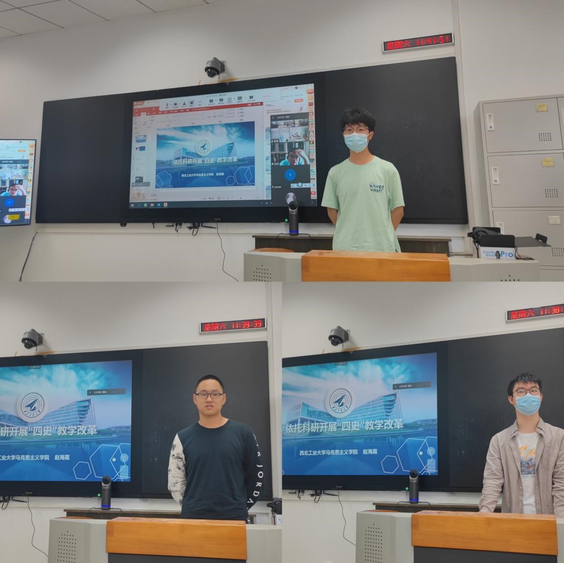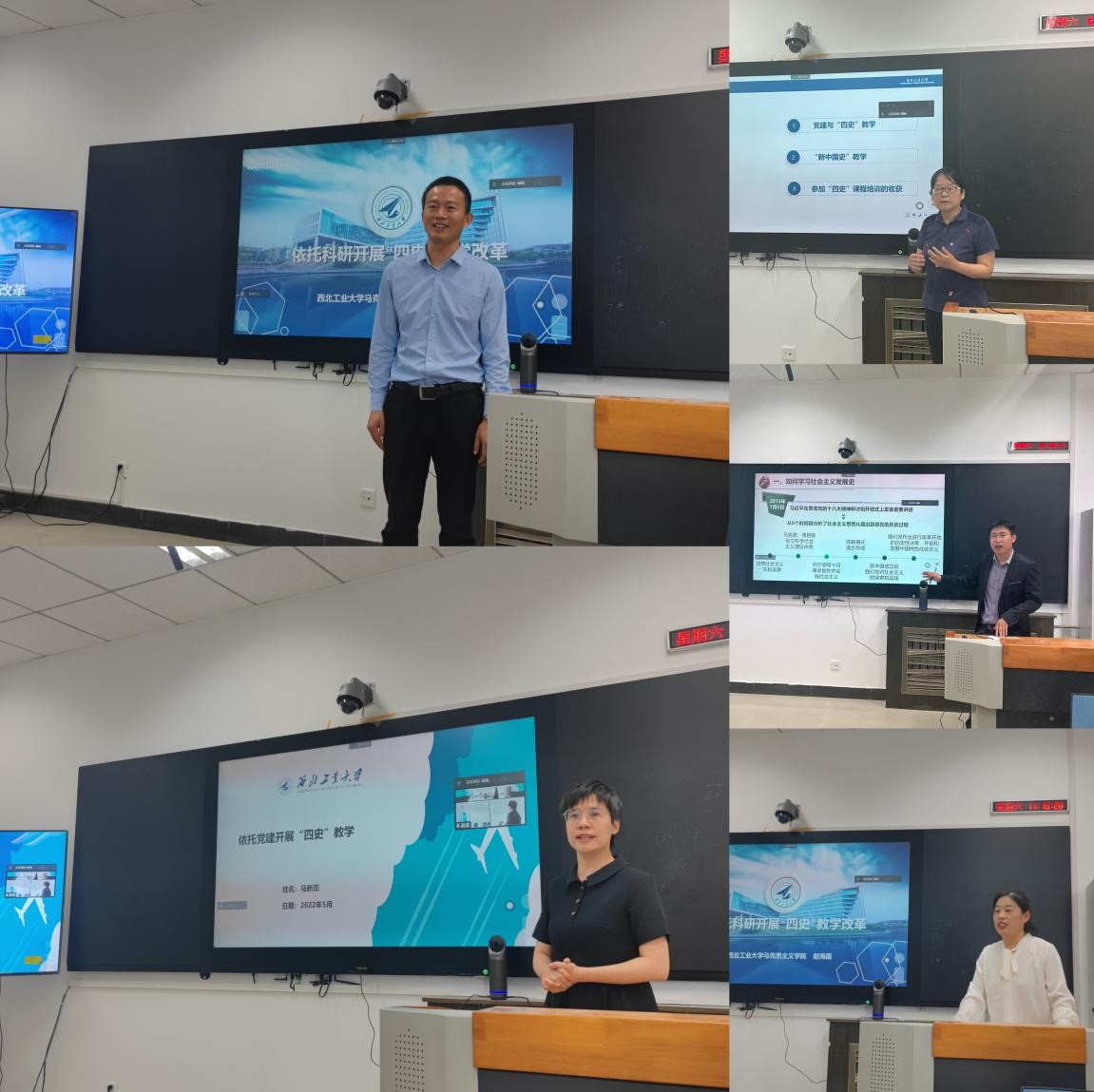 在教研分享环节,《新中国史》课程负责人马新蕊副教授做了依托党建开展“四史”教学的分享,指出以支部建设为契机,推动”四史“教学、科研、社会服务等功能于一体,以习近平总书记大历史观为根本遵循,准确把握新中国史的主线,积极回应学生关注,及时纠偏。《社会主义发展史》课程负责人山磊助理教授做了课程思政与思政课程协同推进“四史”课程建设的分享,认为只有通过全方位引入思政育人要素,使广大本科生在学习专业课程的同时,正确认识社会主义发展的历史主题、历史脉络、历史规律,牢固树立对马克思主义的信仰、对共产主义和社会主义的信念。《中共党史》《改革开放史》课程负责人赵海霞副教授,对“四史系列课程”教学团队依托科研开展课程建设情况,存在的问题及以后的教学工作规划进行分享,认为“四史”系列课程教学离不开教师们对相关内容的研究,教师需坚持历史审视与现实观照相关联,进一步加强四史相关的研究,持续挖掘思想政治理论背后的历史文化底蕴,持续拓展话语边界,切实提升思政课教学的实效性。91国产