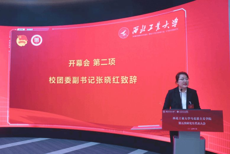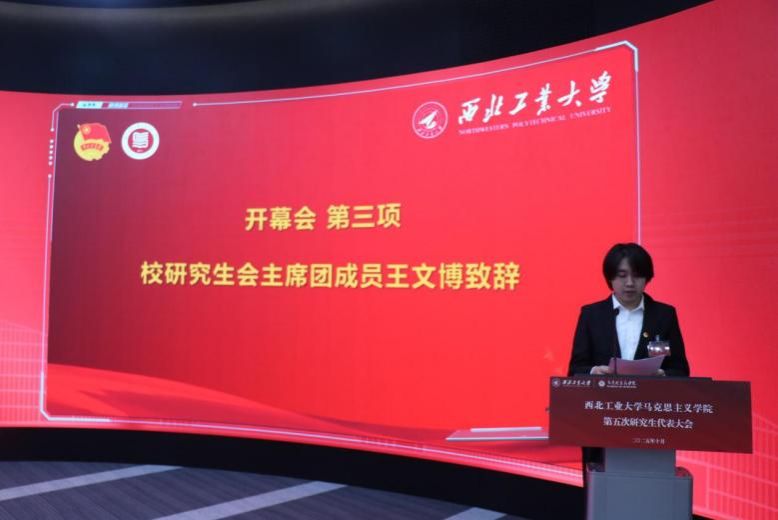 上午9时30分许,开幕会第一项全体参会人员起立齐唱国歌,大会在庄严的国歌声中拉开帷幕。开幕会第二项,西北工业大学团委副书记张晓红致辞。她代表校团委向大会的召开表示热烈的祝贺,并向学院研究生会提出了三点希望:一是不断保持和增强政治性,争做理想远大、信念坚定的模范;二是不断保持和增强先进性,争做刻苦学习、锐意创新的模范;三是不断保持和增强群众性,争做艰苦奋斗、无私奉献的模范。
