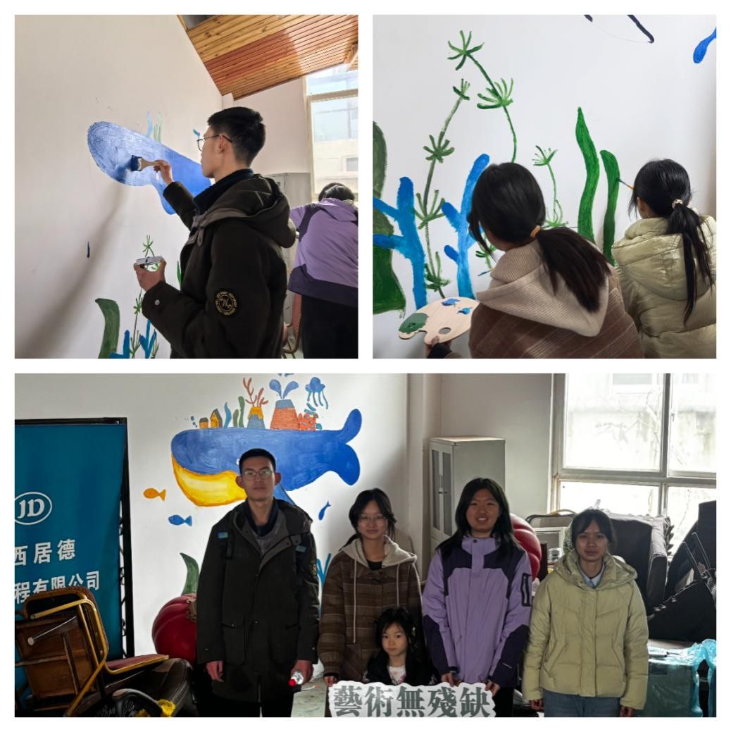 接下来,一组志愿者陪伴残障少年们至户外散步。他们以真诚的互动与悉心的陪伴,化作驱散周遭阴霾天气的一缕暖阳,也悄然融化着与这些特殊孩子们彼此初识时的陌生与隔阂。另一组志愿者则留在室内,与基地负责人就下一步的长效帮扶与深化合作展开了务实的商讨,力求将志愿服务的关怀切实转化、行稳致远。最后,由全体志愿者共同完成的墙面彩绘,让原本单调的基地墙面焕然一新,为这个特殊的小天地增添了五彩缤纷的生机。