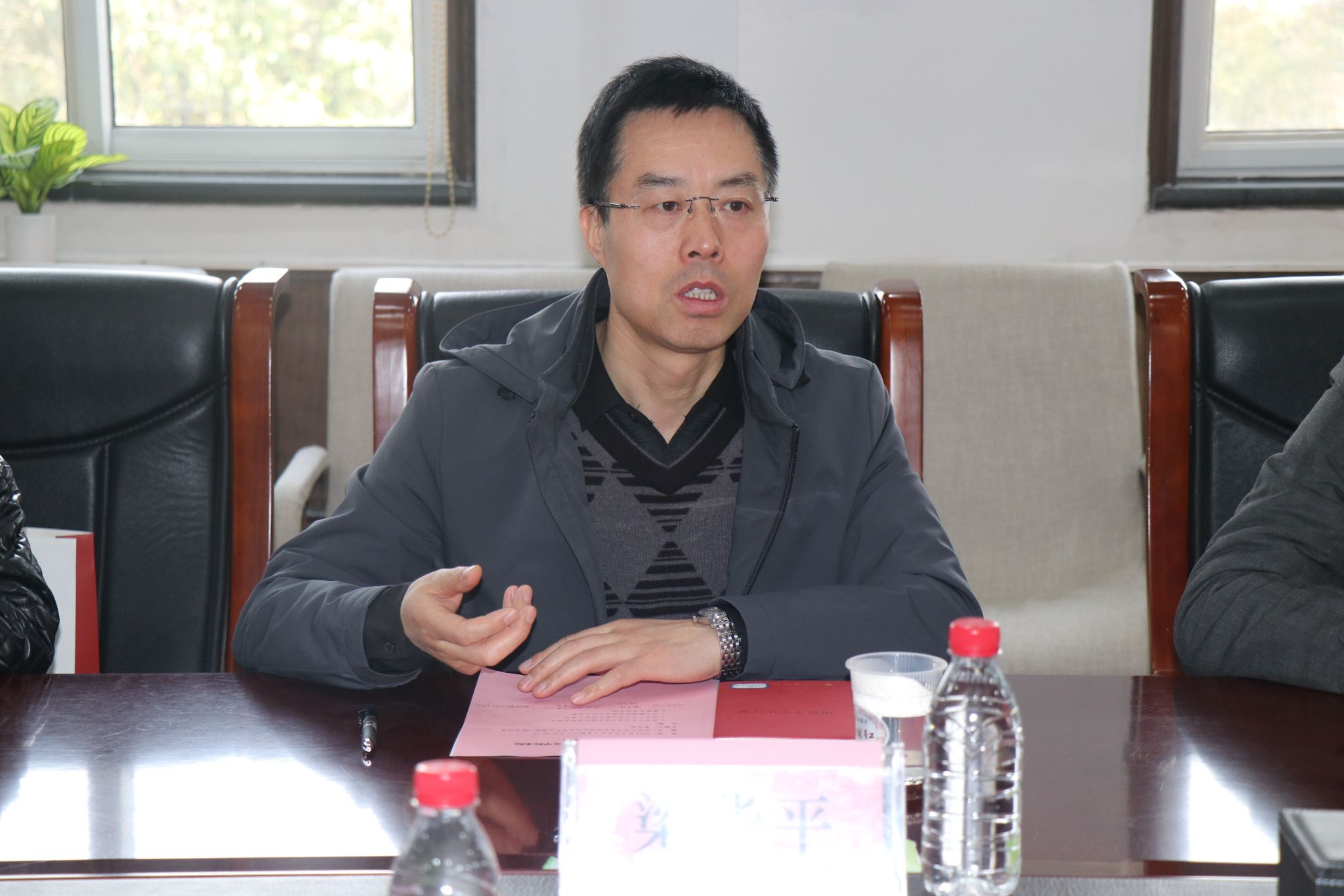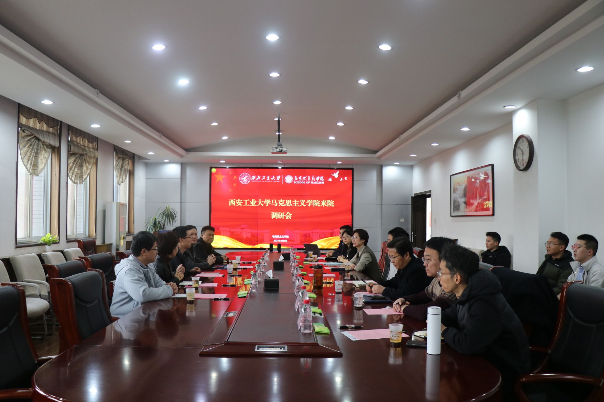 At the beginning of the meeting, Pu Chuanxin expressed his sincere welcome to the visit of the School of Marxism of Xi'an Technological University. He Miao briefly introduced the participants of both sides, then watched the "Northwestern Polytechnical University Promotional Film", "School of Marxism of NPU Promotional Film" and "Si Chuang space Promotional Film" together.