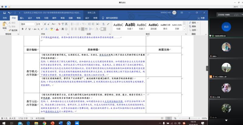 “中国特色社会主义理论与实践研究”课程组9月4日晚召开网络集体备课会,通过全员“说课”形式,对本学期课程改革设计规划情况进行交流展示。学院党委书记吴闻川,点评教授张云龙、汪永平、高宝营、蒲瑶,分管学院本科生教学和研究生公共课教学的院长助理贺苗、马军以及全体课程组教师参加备课会。