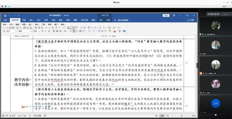 备课会首先进行分组说课,各位任课教师按照学院下发的《91国产 2020-2021秋学期思政课改革创新教学设计规划表》,结合授课专题,从教学内容、教学模式、教学方式、教学资源等方面对课程创新点进行了充分规划设计。将习近平新时代中国特色社会主义思想、社会主义核心价值观、“四史”教育、西工大优良传统和文化、时政热点等有机融入课程,对探究式、体验式、互动式、分众式以及线上线下混合式、现场教学等教学模式以及课堂辩论、演讲、展示、邀请专家同上一堂思政课、远程连线专家、雨课堂信息技术手段运用等教学方法都进行了有效尝试,并充分挖掘慕课、优质教辅材料、视频资料等教学资源。四位点评教授分别对每位教师的说课从内容到形式进行了精彩点评。