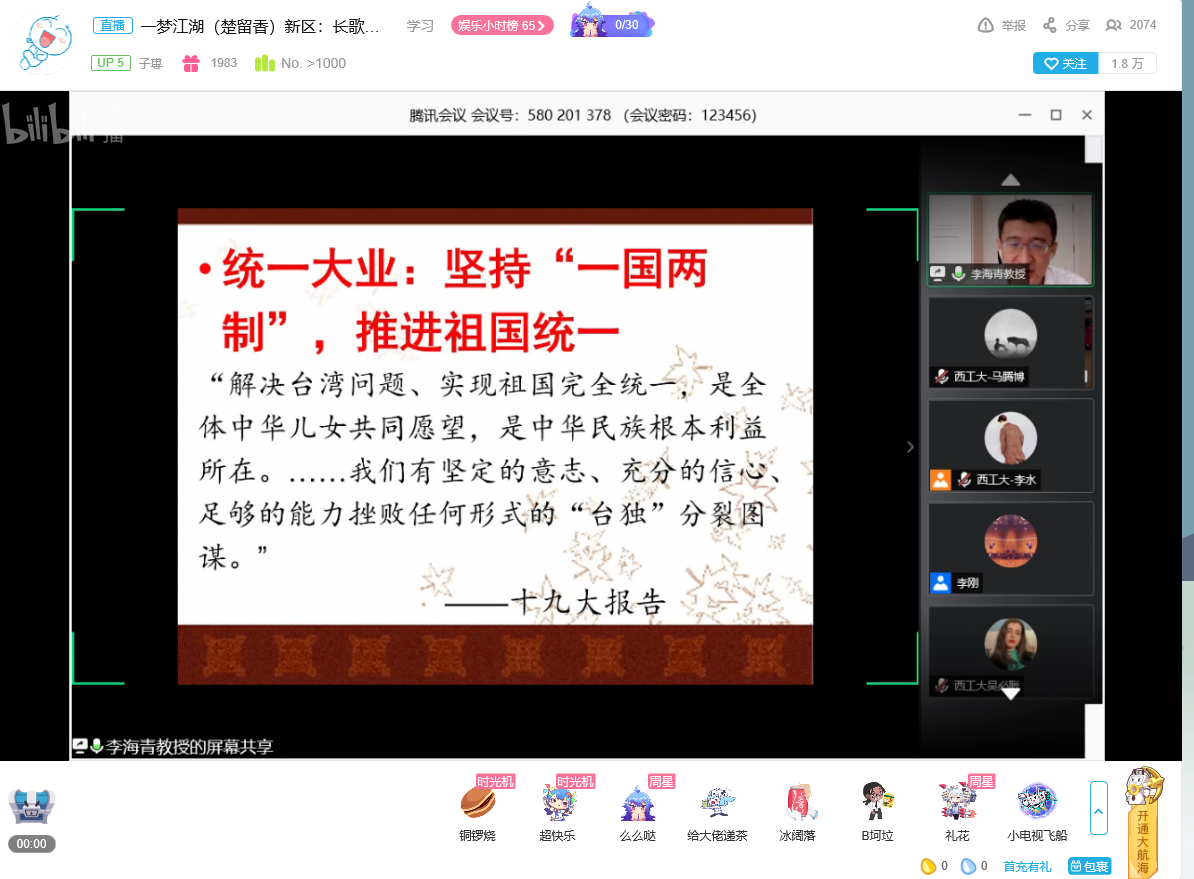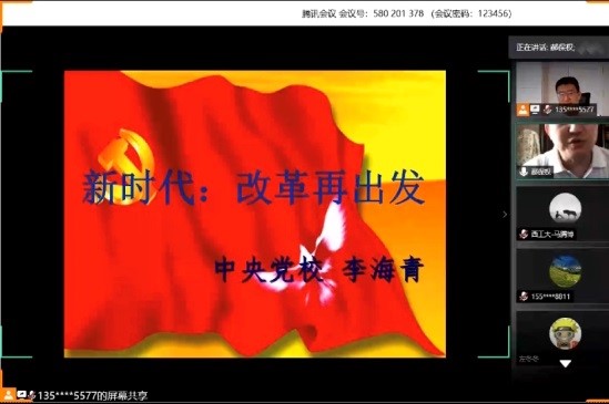 2020年6月4日上午,中共中央党校李海青教授应邀作客91国产 翱翔名家讲堂,在网络平台为广大师生带来了一场主题为《同上一堂思政课——新时代:改革再出发》的精彩报告。来自北京市委党校、山东大学、太原理工、西南交大、东北师范大学、兰州理工和91国产 的共2300余名师生通过腾讯会议和B站,聆听了李教授的讲座。本次翱翔名家讲堂由西北工业大学党委学生工作部主办,91国产 、软件学院、航天学院联合承办,报告会由91国产 副院长郝保权主持。