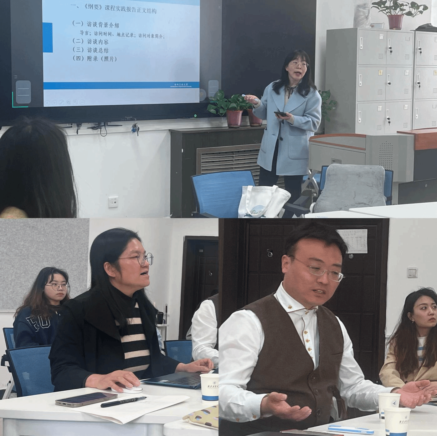 在教研分享环节,汪永平教授阐述了口述史对于承载国家记忆、加深代际沟通、了解社会发展、寻找人生榜样、构建个体生命感悟的重大意义,并对西北工业大学口述史开展现状以及带队调研袁家村、周至水街、东韩村的经历进行了生动细致地介绍,指出口述史活动走入思政课堂,提升了学生的政治认同感,增强了合作精神和实践能力。王欣瑞副教授就口述史调研报告正文结构、问题设计技巧及学生实践报告常见问题进行了深入的分析。她指出口述史区别于其他的学术总结报告的关键特征在于口述史所体现的独特的个体经验,通过细节描摹,使叙事更加生动真实。因此,王老师格外强调附录照片在口述史报告册中的重要性,指出照片本身就是对历史的一种真实记录。房小捷副教授在对以上两位老师进行补充发言的同时,对西安以及西北工业大学现有口述史资源进行了详细的介绍。房老师指出要充分挖掘西安独特的文化资源,如流行摇滚音乐与古典音乐的碰撞;体会经典作家笔下的人物故事,从历史变迁中感悟西安的风土人情;探寻网红城市的培育,打造专属西安的文化IP;关注当前西安城市化迅速发展过程中不同社会阶层面临的境遇变迁;以及聚焦西工大特色,如杰出校友对话、军工资源、高科技项目等。