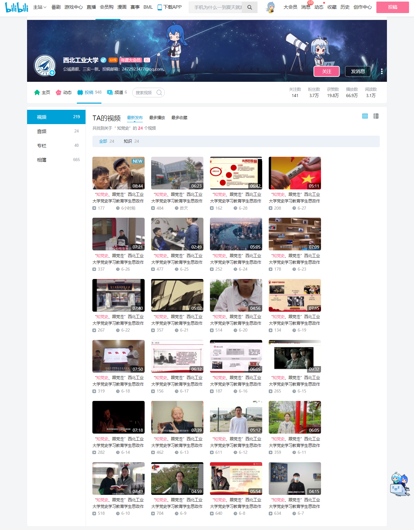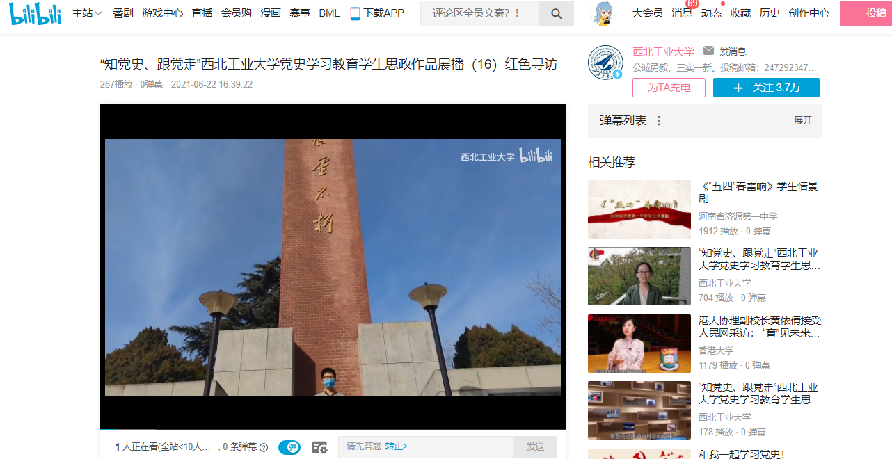 举行了“知党史、跟党走”党史学习教育思政作品大赛,经过评比,选出了100个优秀视频并举行颁奖仪式。自6月7日起,优秀作品在西北工业大学bilibili官方平台展播,至今已有数十个作品在b站与大众见面,这些作品或形式新颖,或史实扎实,或真情流露,都是工大学子用自己的方式向中国共产党成立100周年献礼。