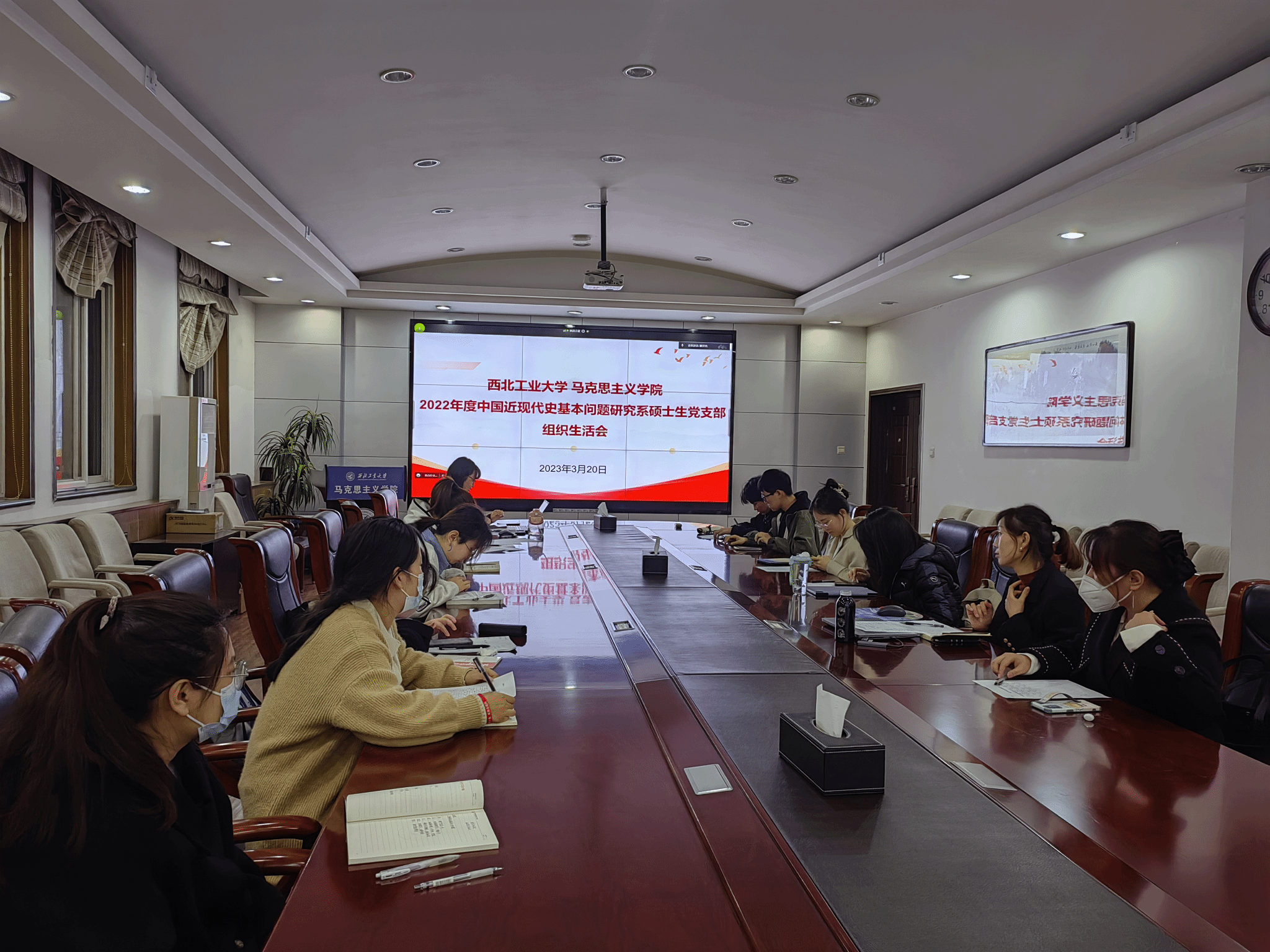 中国近现代史基本问题研究系硕士生党支部于学院楼208会议室召开2022年度组织生活会和开展民主评议党员工作。此次会议由支部书记滕洋洋主持,学院团工委书记、辅导员王换老师全程参会并进行督导。