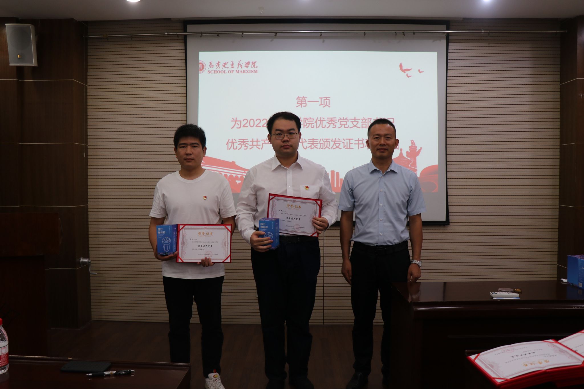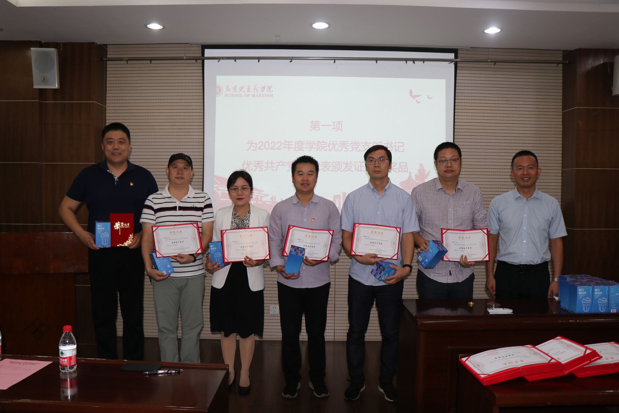 首先,蒲传新书记为2022年度学院优秀党支部书记李刚、陈诚平、王慧新、张昊,教工优秀共产党员代表杨永强、杨小勋、陈亚丽,学生优秀共产党员代表张昊、李水颁发证书和奖品,并对本次获奖的优秀教工党员18人,优秀学生党员36人表示祝贺。同时,蒲传新书记强调,证书是一份荣誉,更是一份激励,希望获奖同志为学院党建工作继续贡献力量。