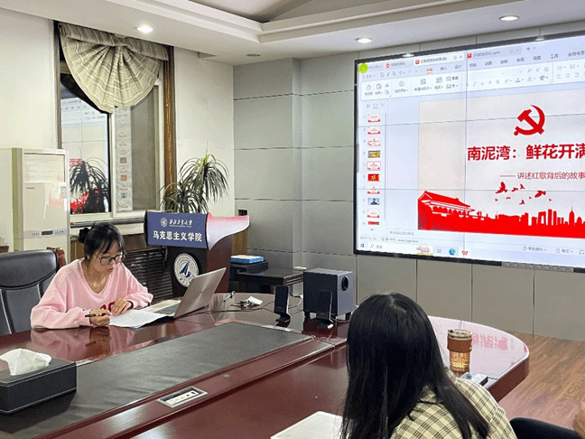 马克思主义基本原理系硕士生党支部、马克思主义中国化研究系硕士生党支部、中国近现代史基本问题研究系硕士生党支部、思想政治教育系硕士生党支部和博士生第三党支部于学院楼208会议室联合开展“嘹亮红歌映党史 讲述红歌背后的故事”主题党日活动,一起唱红歌、讲党史、颂党恩。会议由马克思主义基本原理系硕士生党支部委员崔颖文主持。