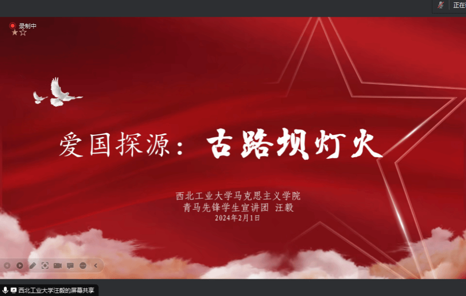 青马先锋学生宣讲团成员汪毅带来了以《爱国探源:古路坝灯火》为题的宣讲。汪毅同学将爱国主义与延安精神贯穿宣讲主题,通过“沉与浮”“冰与火”“梦与歌”三个篇章生动深情地讲述了国立西北工学院的历史血脉,鼓舞师生爱党爱国,大力弘扬伟大建党精神和延安精神,坚定理想信念,以“功成不必在我,功成必定有我”的决心奉献自身、实现价值。