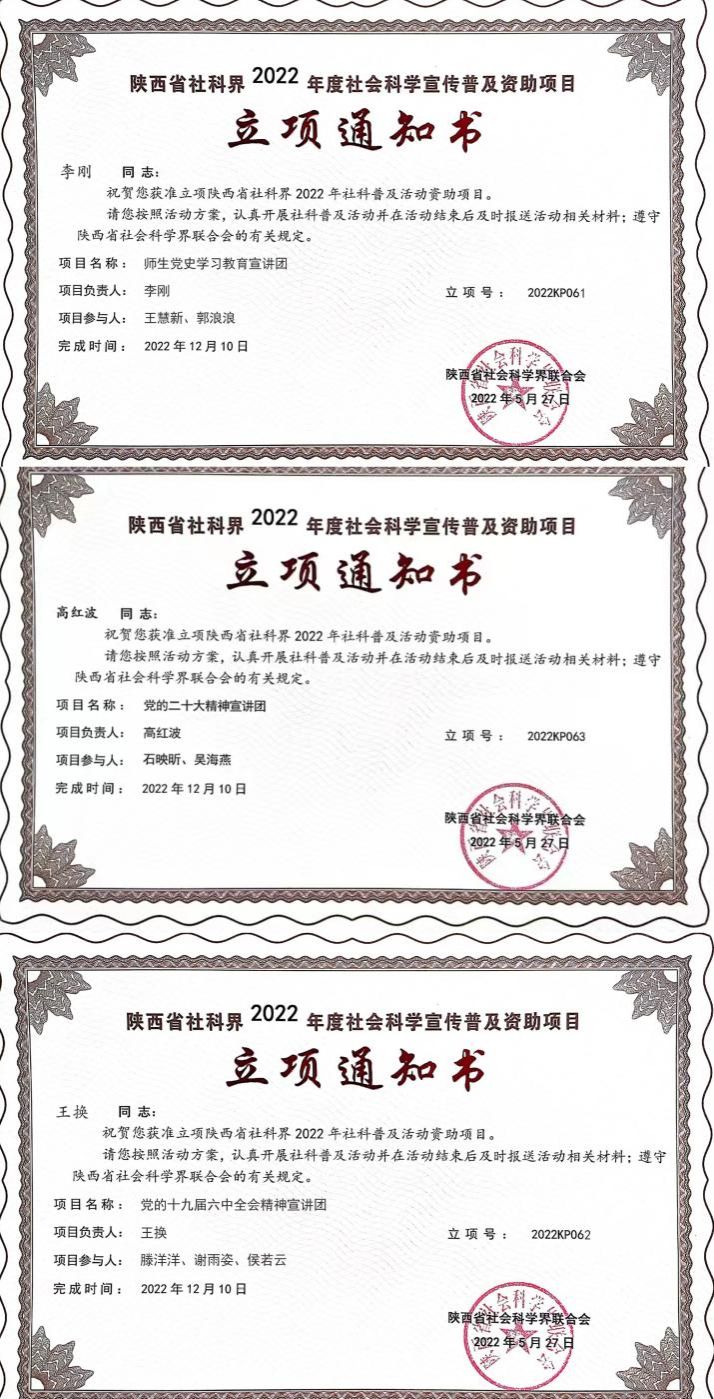 理论成果方面,获批陕西省社科联社科普及活动项目三项,分别为师生党史学习教育宣讲团、党的二十大精神宣讲团、党的十九届六中全会精神宣讲团,以及学校共青团工作研究课题一项《新时代高校马理论学科青年理论宣讲“轻骑兵”创新培育机制研究》,《关于新时代大学生理论宣讲团创新机制的调查研究》调研报告荣获第二十届“三航杯”大学生课外学术科技作品竞赛二等奖。