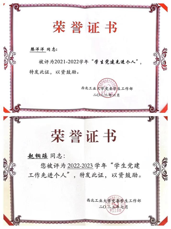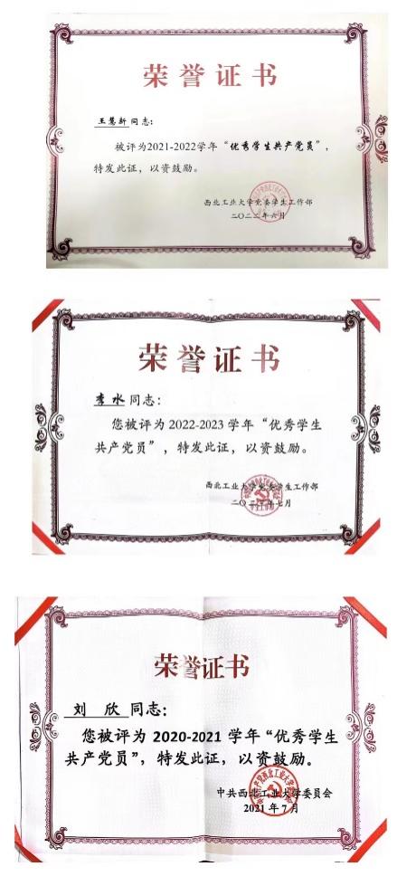原硕士生党支部曾荣获“全国党建工作样板支部”,连续四年斩获学生先进党支部,2022年5月顺利通过教育部第二批新时代高校党建“双创”工作样板支部的验收;学院党委荣获西北工业大学第三批党建工作“标杆学院”,连续三年荣获学生党建先进学院;博士生第一党支部荣获学校第三批党建工作“样板支部”。