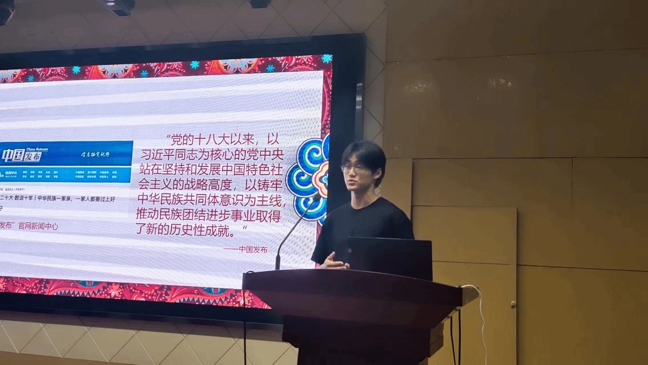 教育实验学院的杨文浩以西工大优秀学子麦吾兰·麦麦提敏为例,通过回顾中国脱贫攻坚战的伟大胜利,分析了新时代民族团结进步事业的有利条件,为铸牢中华民族共同体意识向青年学子发出号召——“以民族百花魂,铸中华赤子心”。