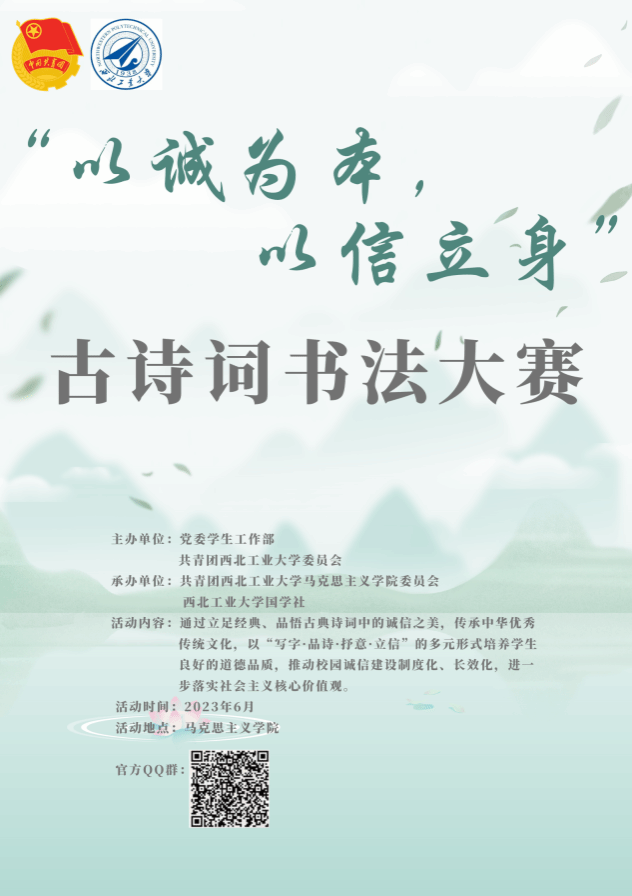 为深入贯彻落实习近平新时代中国特色社会主义思想和党的二十大精神,加强学生诚信教育,推动廉洁文化与中华优秀传统文化有机融合,引导广大青年学生在传承中国古典诗词中涵养身心,敦品励行,6月16日,由西北工业大学党委学生工作部、共青团西北工业大学委员会主办,共青团91国产