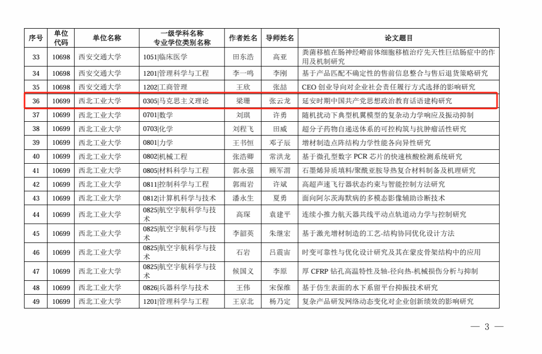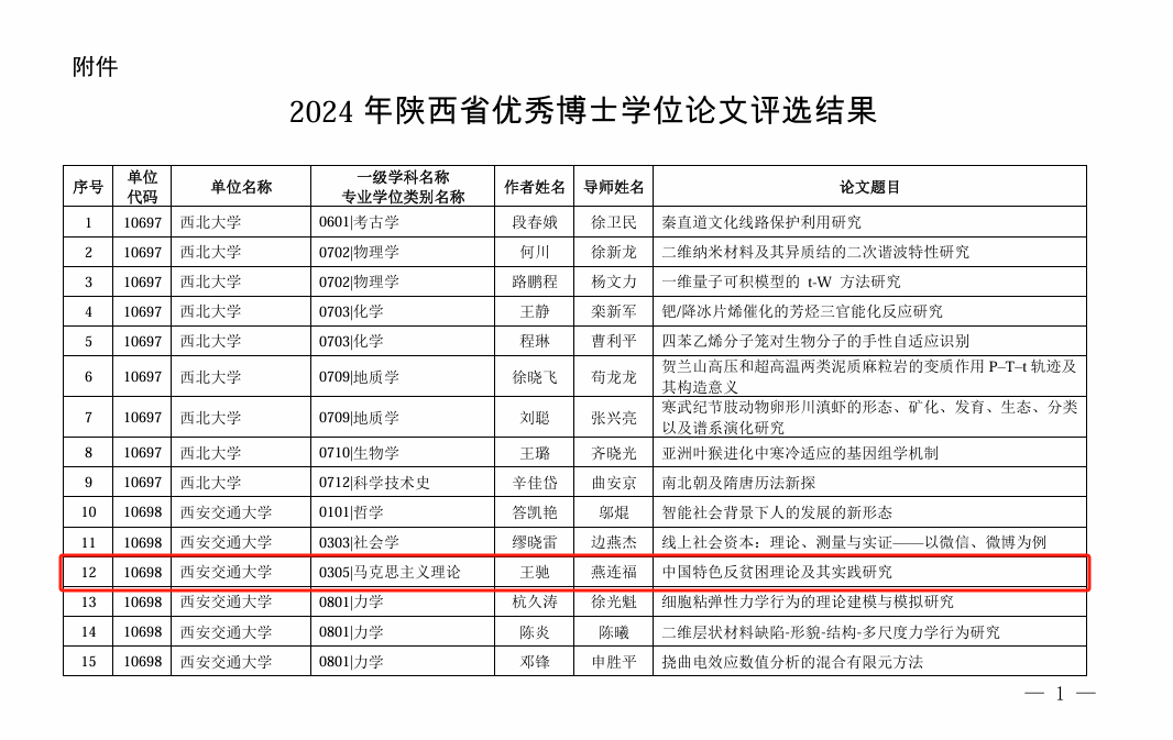 王驰老师、梁珊同学的博士学位论文《中国特色反贫困理论及其实践研究》(指导老师:燕连福)、《延安时期中国共产党思想政治教育话语建构研究》(指导老师:张云龙)双双入选。