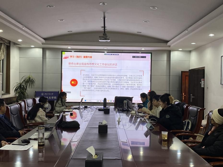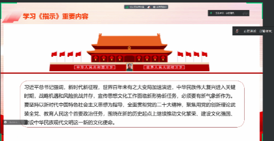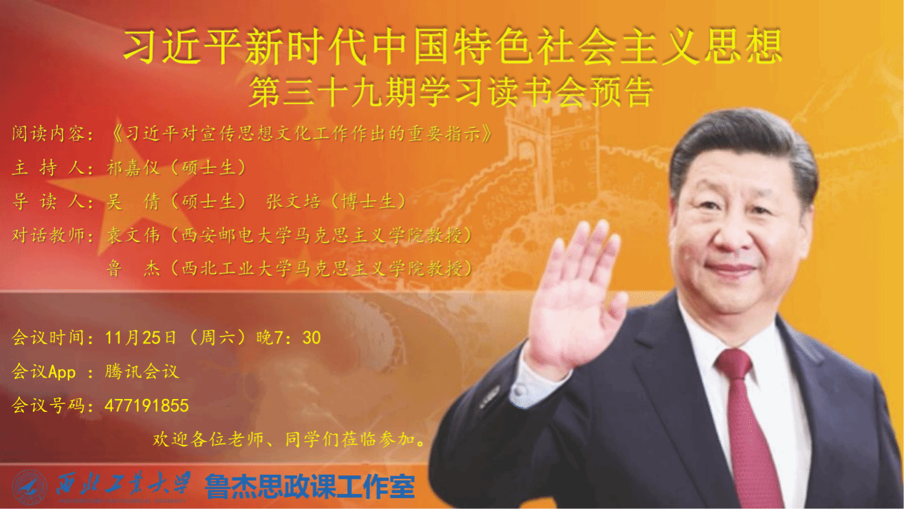 习近平新时代中国特色社会主义思想学习读书会第三十九期活动主题围绕《习近平对宣传思想文化工作作出的重要指示》进行学习研讨。本次读书会由学院思想政治教育系主任、博士生导师鲁杰教授发起,学院硕士生祁嘉仪主持,西安邮电大学91国产