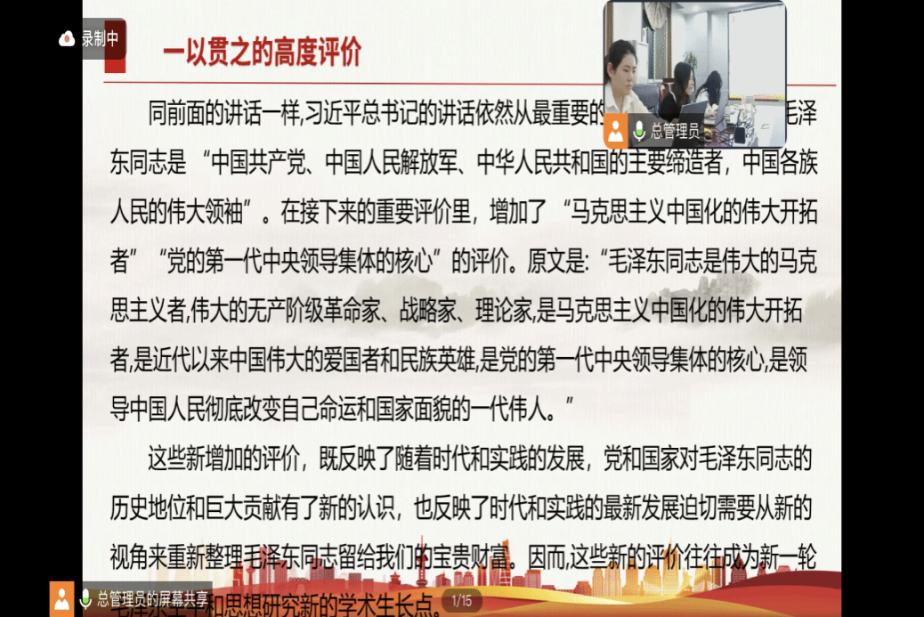 随后,博士生李旭同学从毛泽东同志的伟大实践、历史贡献、历史地位的角度进行了精彩的导读。她强调了开辟马克思主义中国化时代化新境界、进一步深化改革开放、深入推进全面从严治党等“六个要”的现实要求,特别强调了“只有时刻保持解决大党独有难题的清醒和坚定,把党建设得更加坚强有力,才能确保中国式现代化劈波斩浪、行稳致远。”同时,她还聚焦毛泽东思想活的灵魂以及当前的研究现状,为师生们提供了宝贵的学术视角。最后她用充沛的情感,引用毛泽东同志的一段话作为结尾:“东方欲晓,莫道君行早。踏遍青山人未老,风景这边独好。”