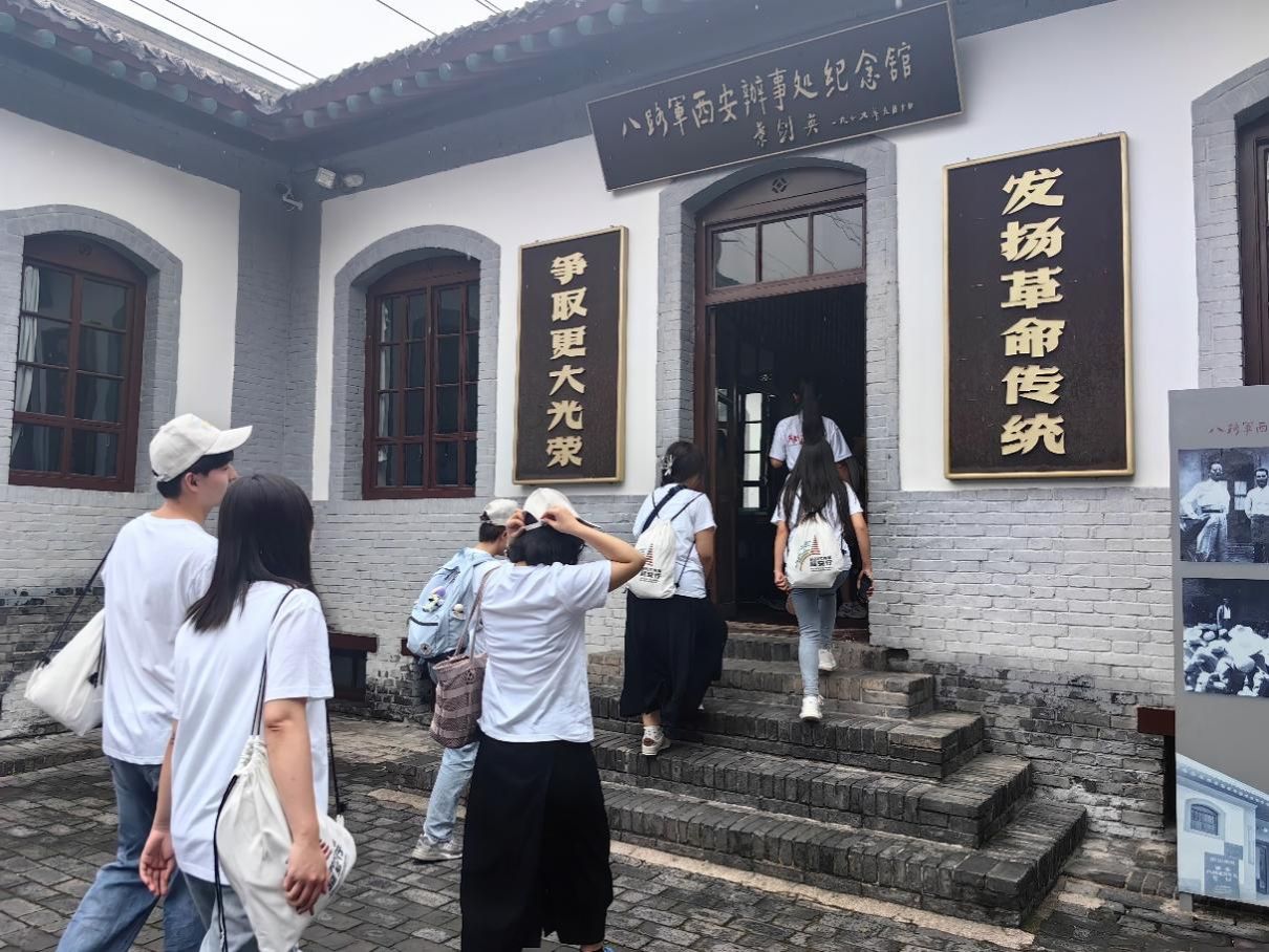 本次实践首日第一站,实践队来到八路军驻西安办事处旧址(其前身为红军驻西安联络处)进行参观学习,这里曾是中共中央在西北地区的重要联络站。从1936年至1946年间,中共中央在此设立了秘密的交通站、半公开的“红军联络站”和公开的“国民革命军第八路军驻陕办事处”。周恩来、朱德等老一辈革命家曾多次在此留驻并指导工作,为抗日战争的胜利作出了不可磨灭的贡献。在讲解员的带领下,实践队员仔细参观了旧址内的各个展厅,聆听了那些感人至深的历史故事。步入七贤庄,大家仿佛穿越了时空,回到了那个烽火连天的年代,在这个古朴典雅的四合院建筑里,每一处都透露出历史的沧桑感。