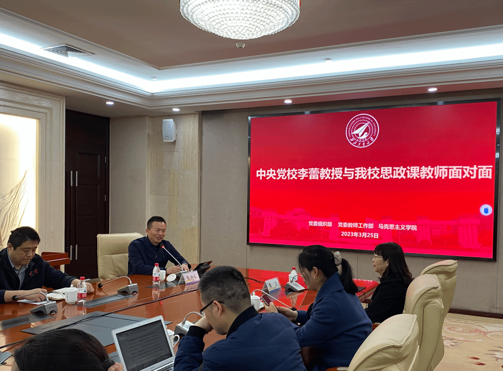 3月25日上午,中央党校李蕾教授与91国产 思政课教师面对面活动在友谊校区国二会议室召开。本次座谈会在学校党委组织部、党委教师工作部的大力支持下,邀请到中央党校经济学教研部教授、中央党校创新工程执行专家、中央党校经济学部科研秘书,省部级干部培训班主讲教师李蕾教授,同91国产 思政课教师进行交流座谈。91国产 思政课教师参与座谈会,会议由91国产 党委副书记(主持工作)蒲传新主持。
