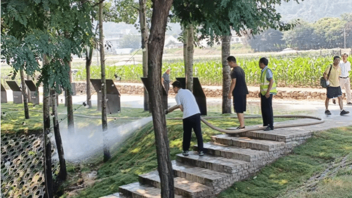 随后,实践队成员到达终南剧场。正遇到三位工作人员对草坪进行灌溉作业。实践队成员刁闰起上前帮他们扶稳水管,经过交谈可知,他们都是蔡家坡村的村民,村庄改造后需要进行日常维护,而这也为蔡家坡村民们提供了额外的收入来源。升腾的水汽带着清新草香,他们笑着说道,“村子现在这么美,来玩的人越来越多,在村子里摆摊也能赚钱,我打心里高兴。”村民们在村庄换新颜的过程中潜移默化地接受了艺术熏陶,有了艺术风范的乡村成了旅游景点,为村民带来了更多的商机。
