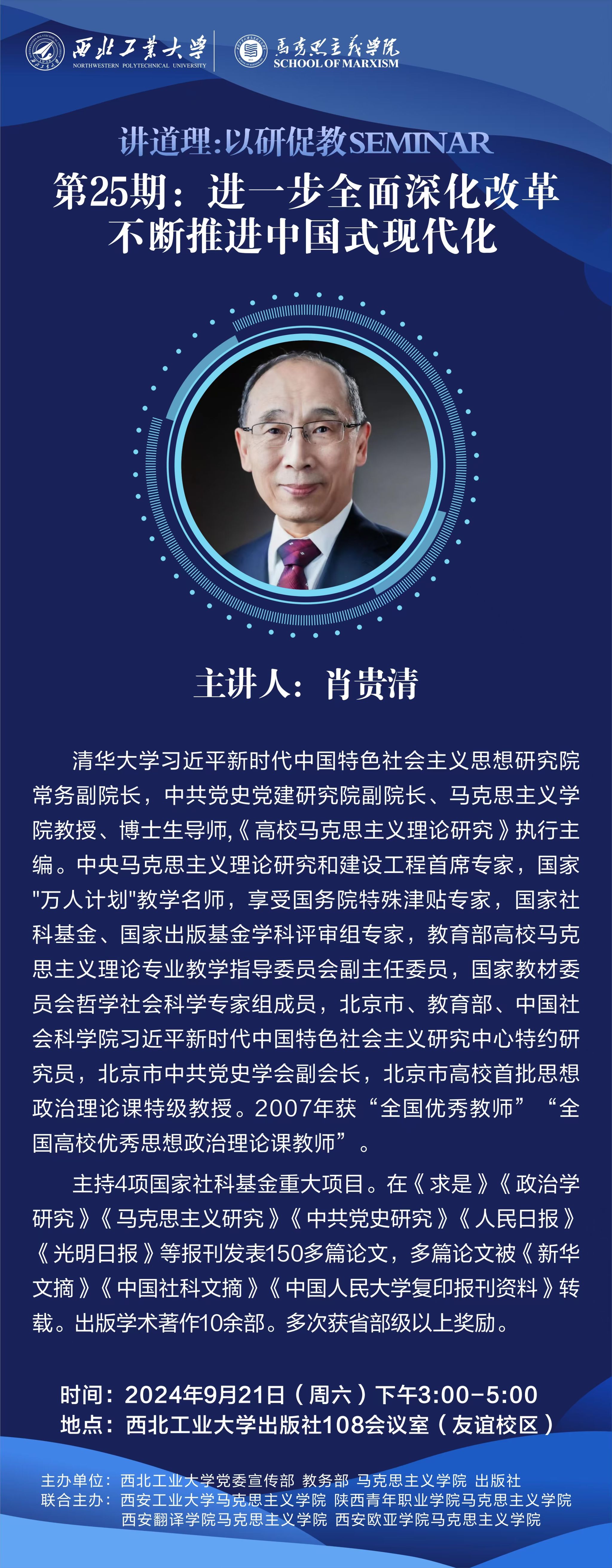 创设的“讲道理:以研促教seminar”的第25期活动于2024年9月21日在西北工业大学出版社108会议室开展。活动特邀清华大学肖贵清教授以《进一步全面深化改革 不断推进中国式现代化》为主题,指导党的二十届三中全会精神融入思政课的集体备课,此次活动由西北工业大学党委宣传部、教务部、91国产